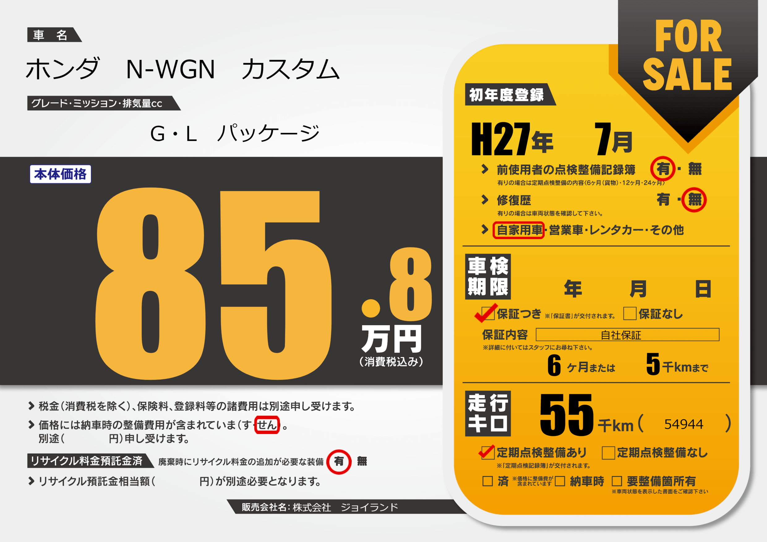 | 車名 | ホンダ N-WGN カスタム | グレード ミッション 排気量 |