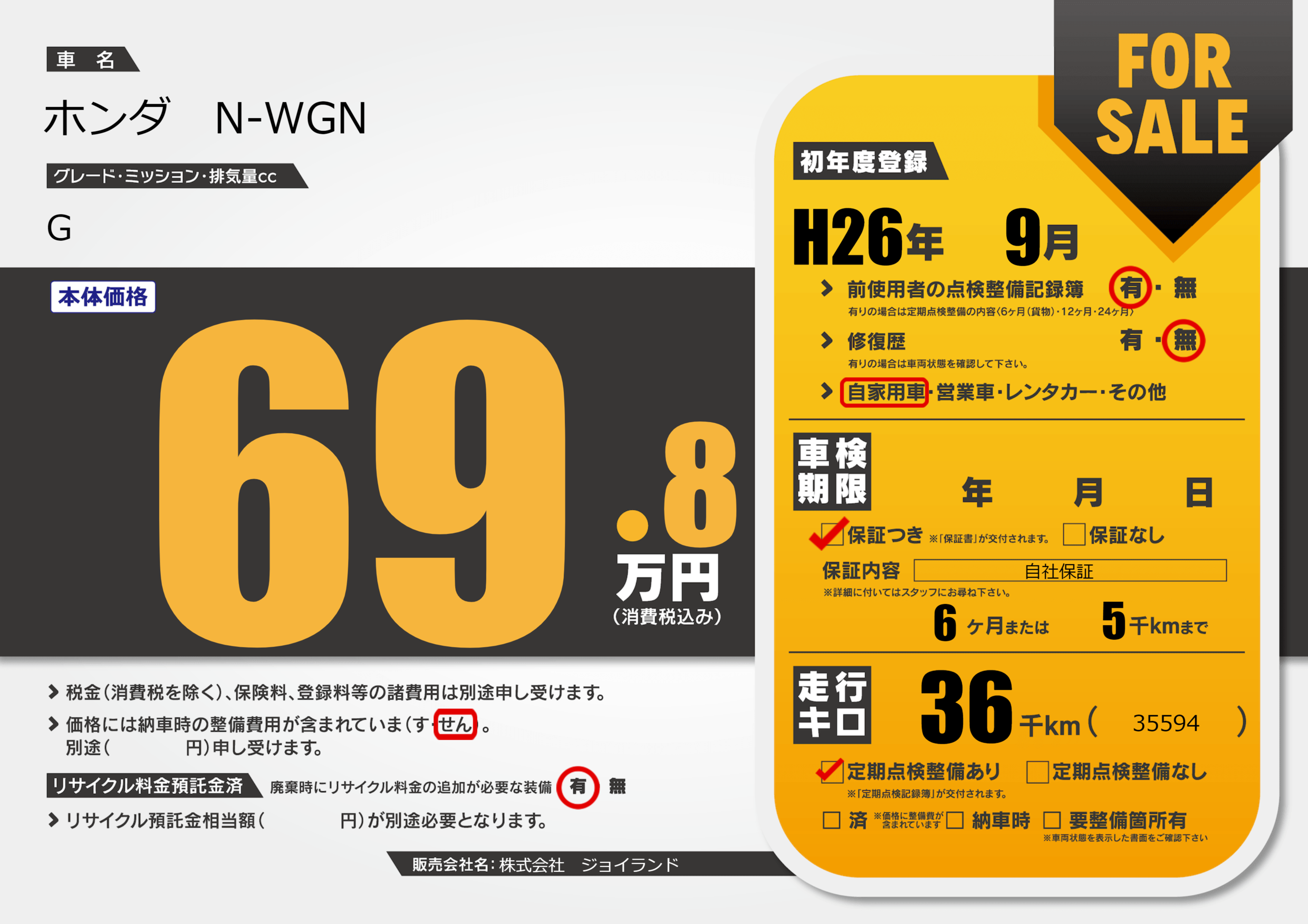 | 車名 | ホンダ N-WGN | グレード ミッション 排気量 |