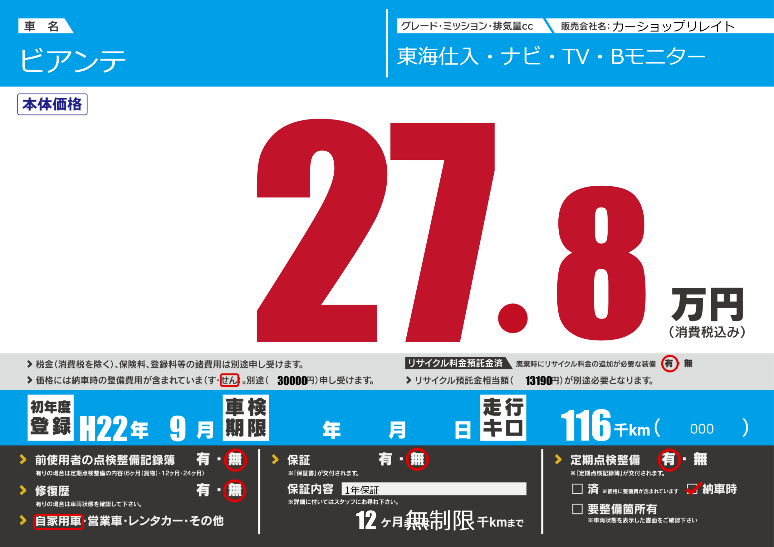 | 定期点検整備 | 定期点検整備あり 納車時あり | ||