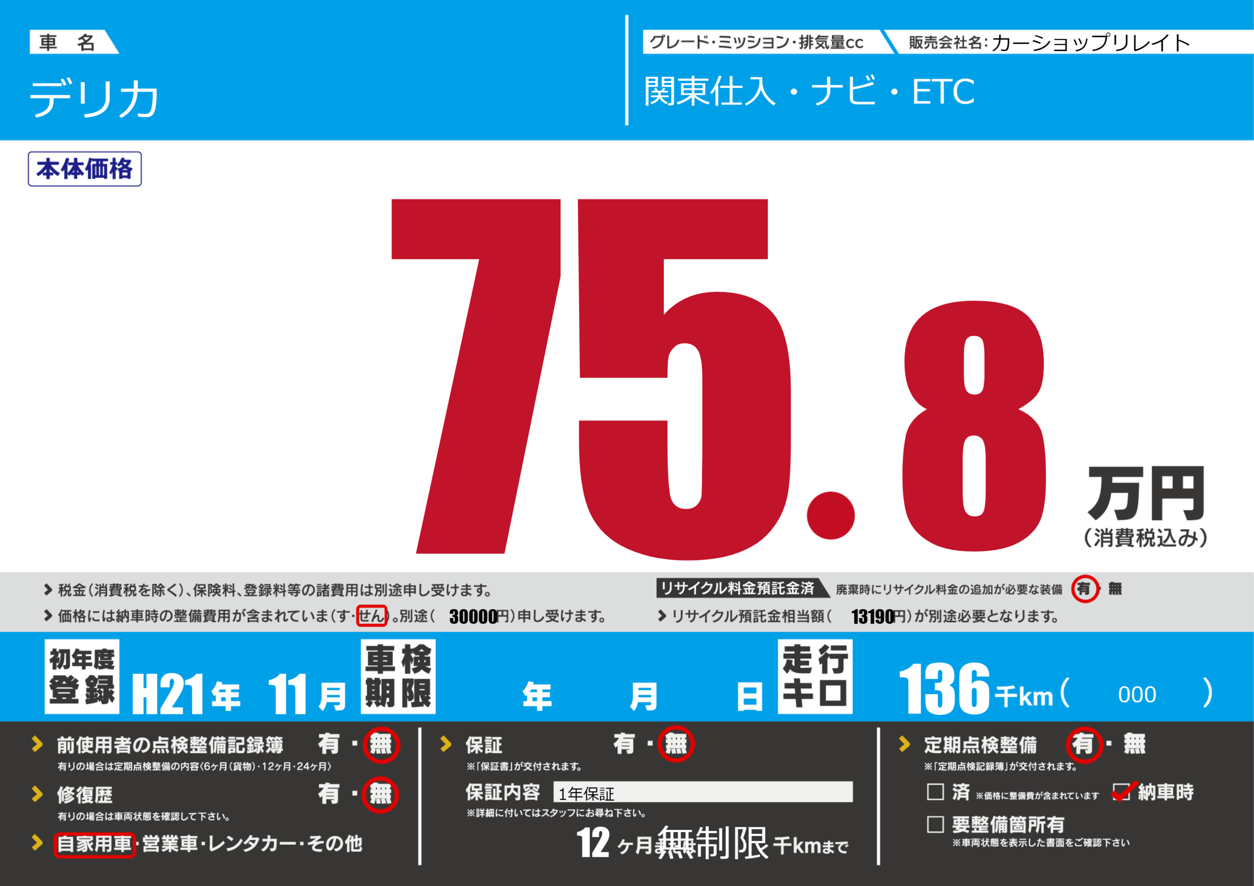 | 定期点検整備 | 定期点検整備あり 納車時あり | ||
