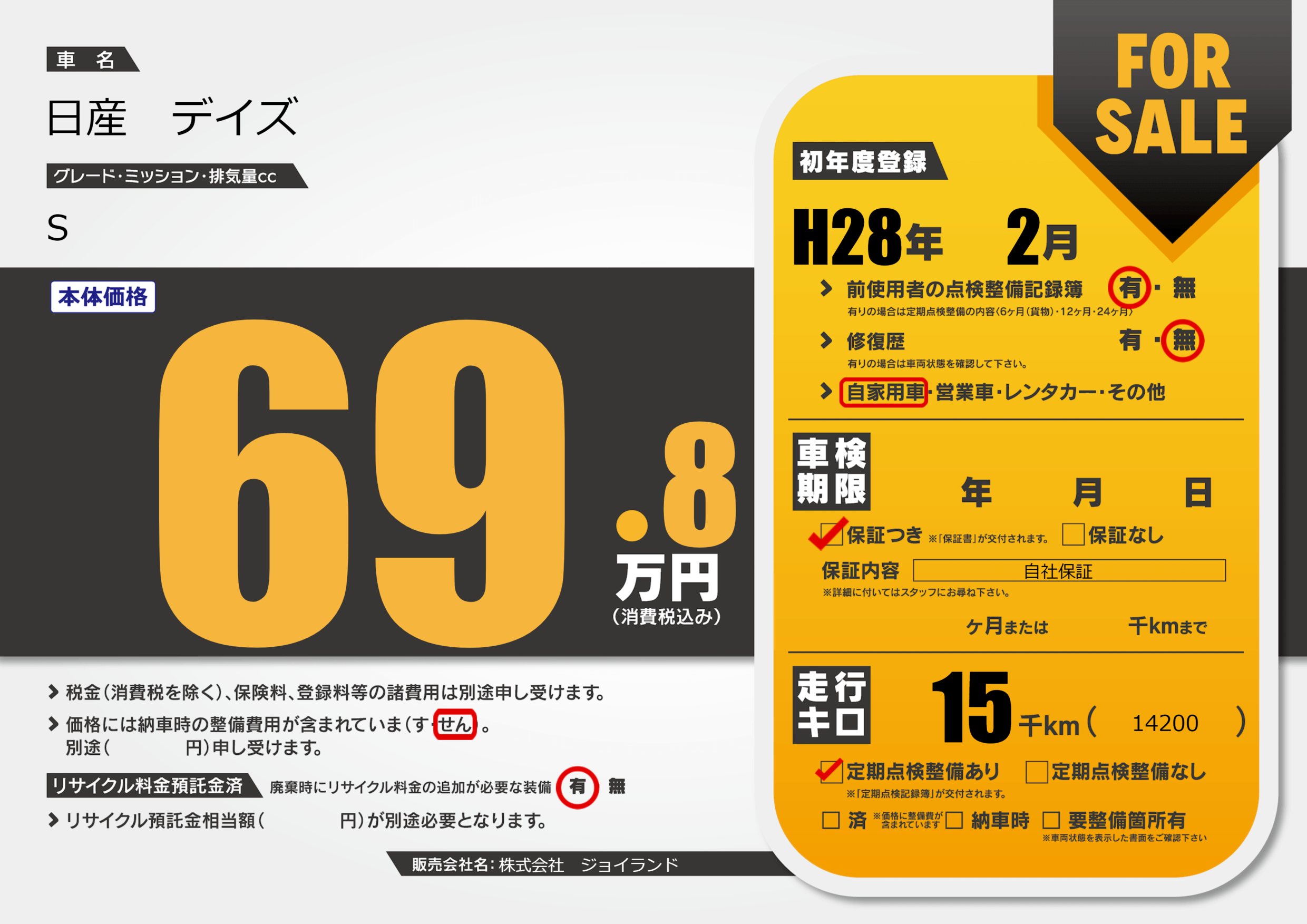 | 車名 | 日産 デイズ | グレード ミッション 排気量 |