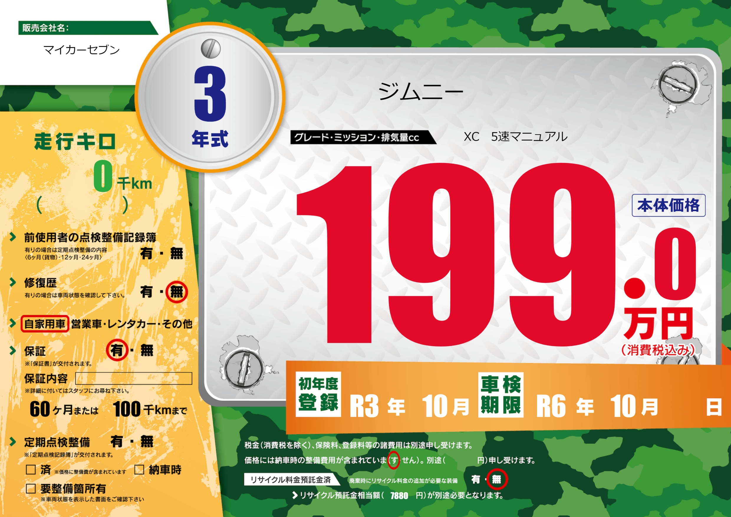 | 車名 | ジムニー | グレード ミッション 排気量 |
