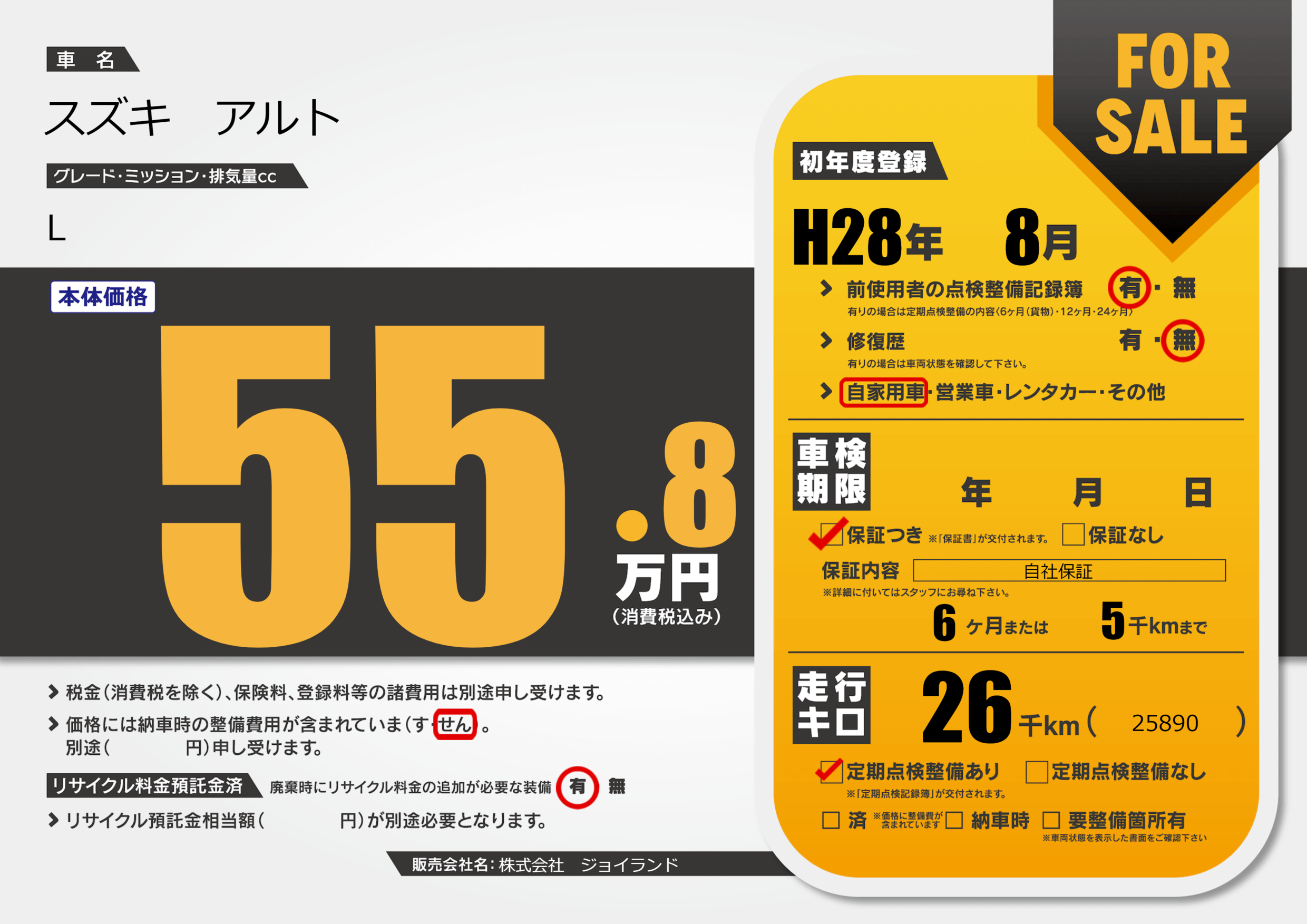 保証付き 保証内容( 自社保証) 6ヶ月または(5)千kmまで |