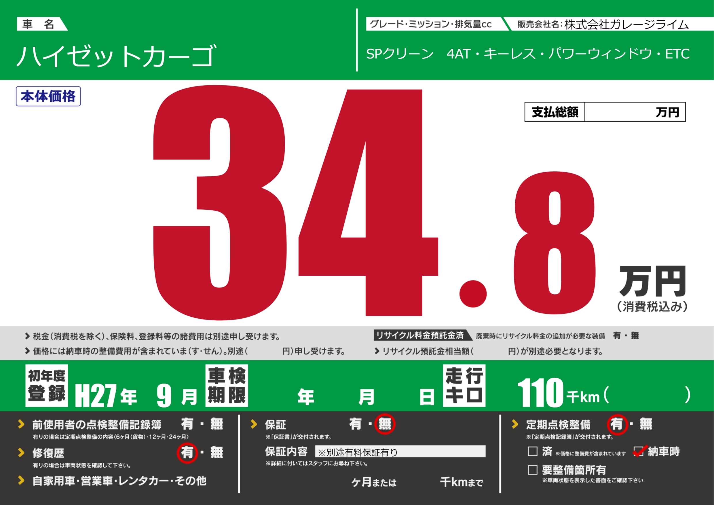 保証なし 保証内容(※別途有料保証有り) ---ヶ月または()千kmまで |