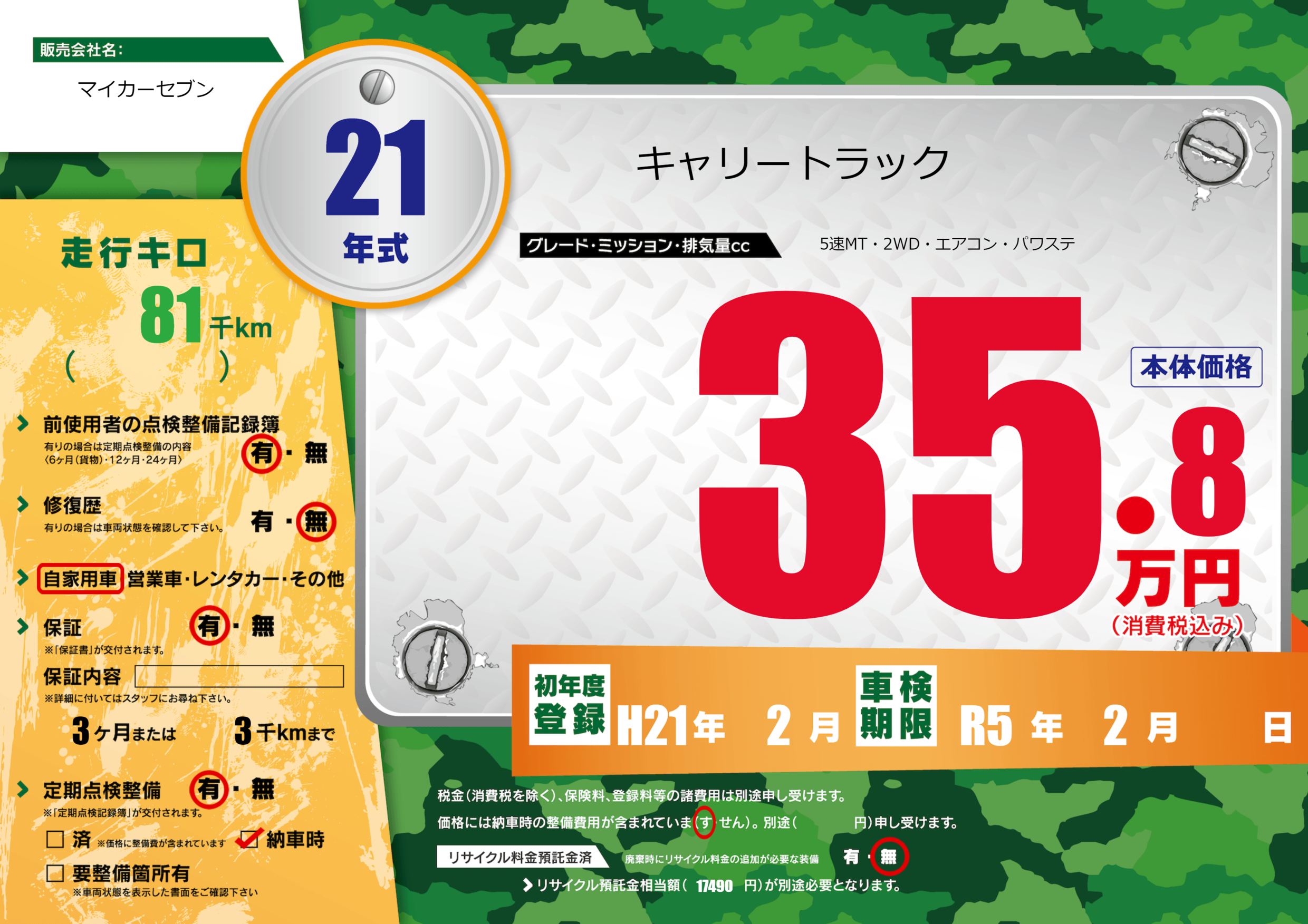 保証付き 保証内容(---) 3ヶ月または(3)千kmまで |