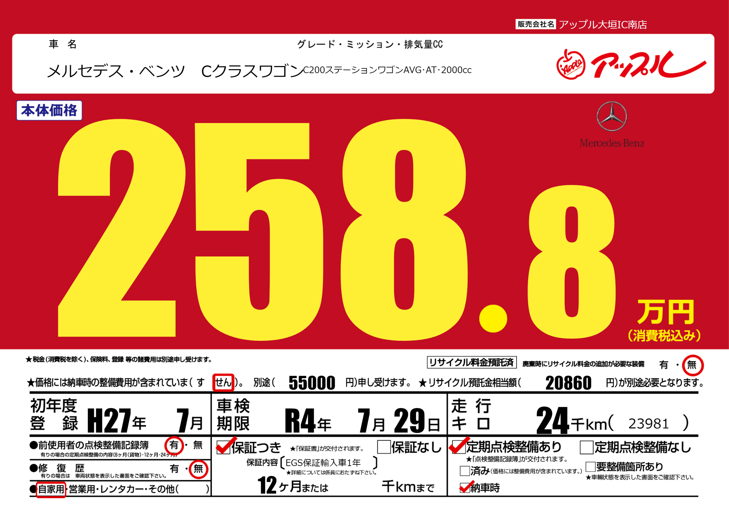| 車名 | メルセデス・ベンツ Cクラスワゴン | グレード ミッション 排気量 |