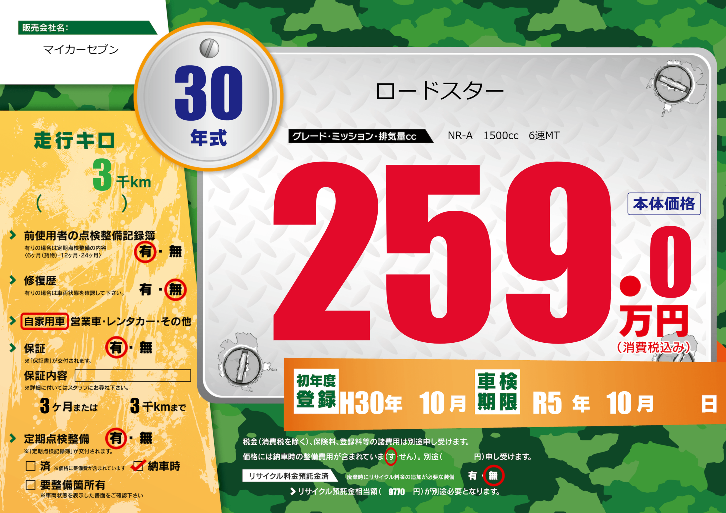 | 車名 | ロードスター | グレード ミッション 排気量 |