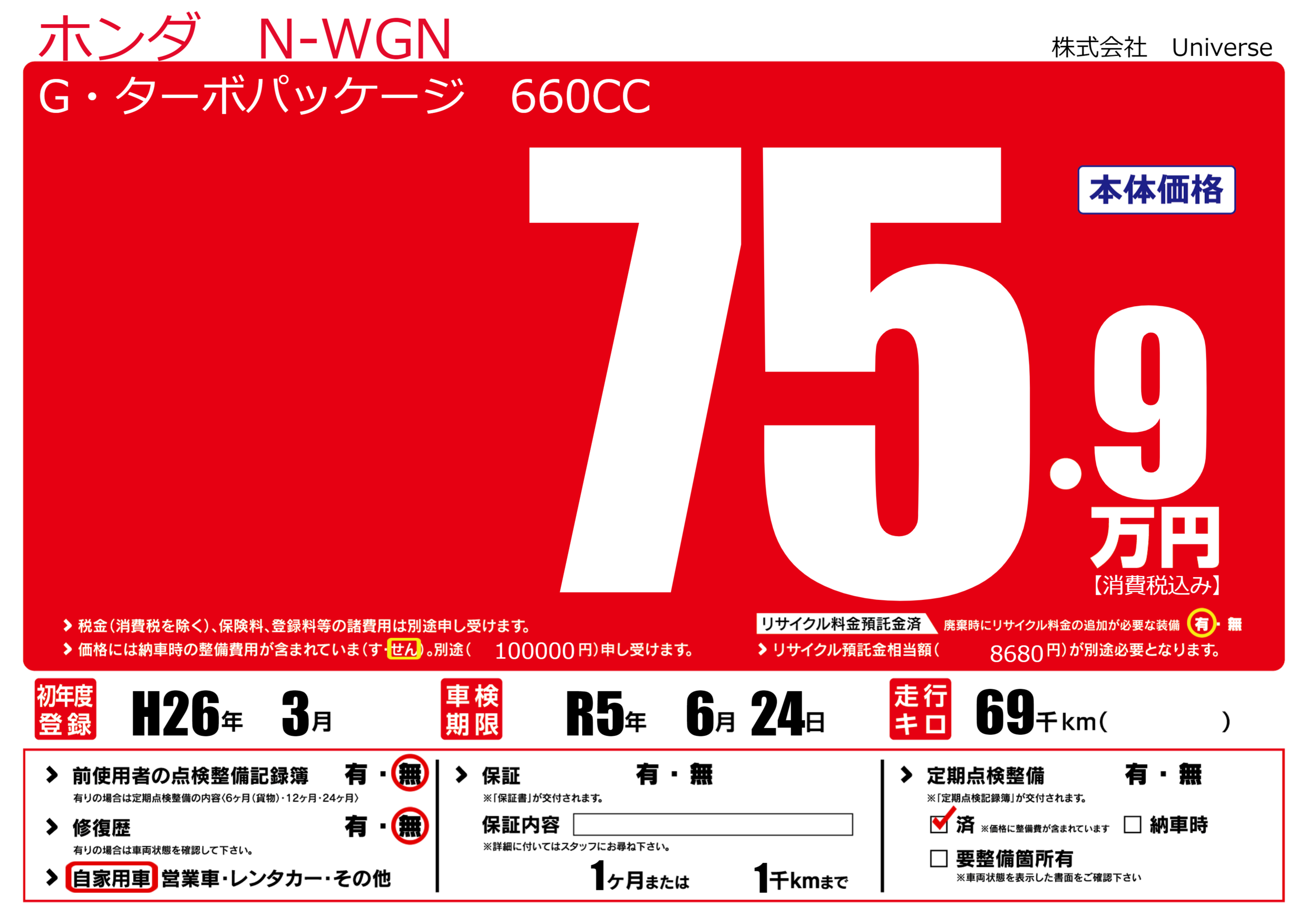 | 車名 | ホンダ N-WGN | グレード ミッション 排気量 |