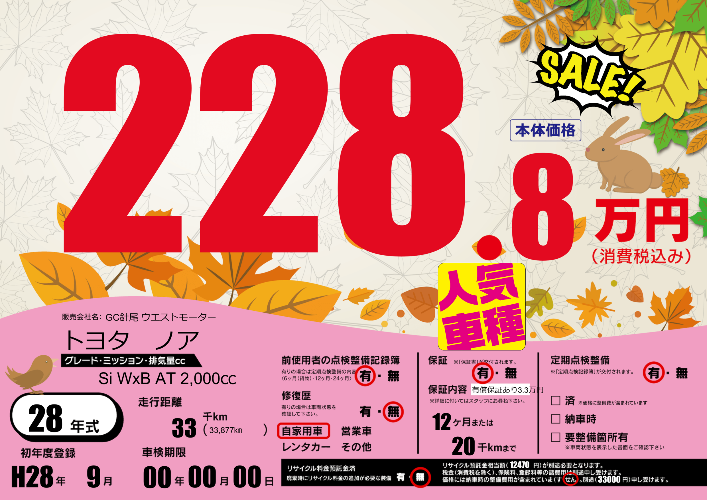 | 走行キロ | 3.3万km | 初年度登録 | H28年9月 |