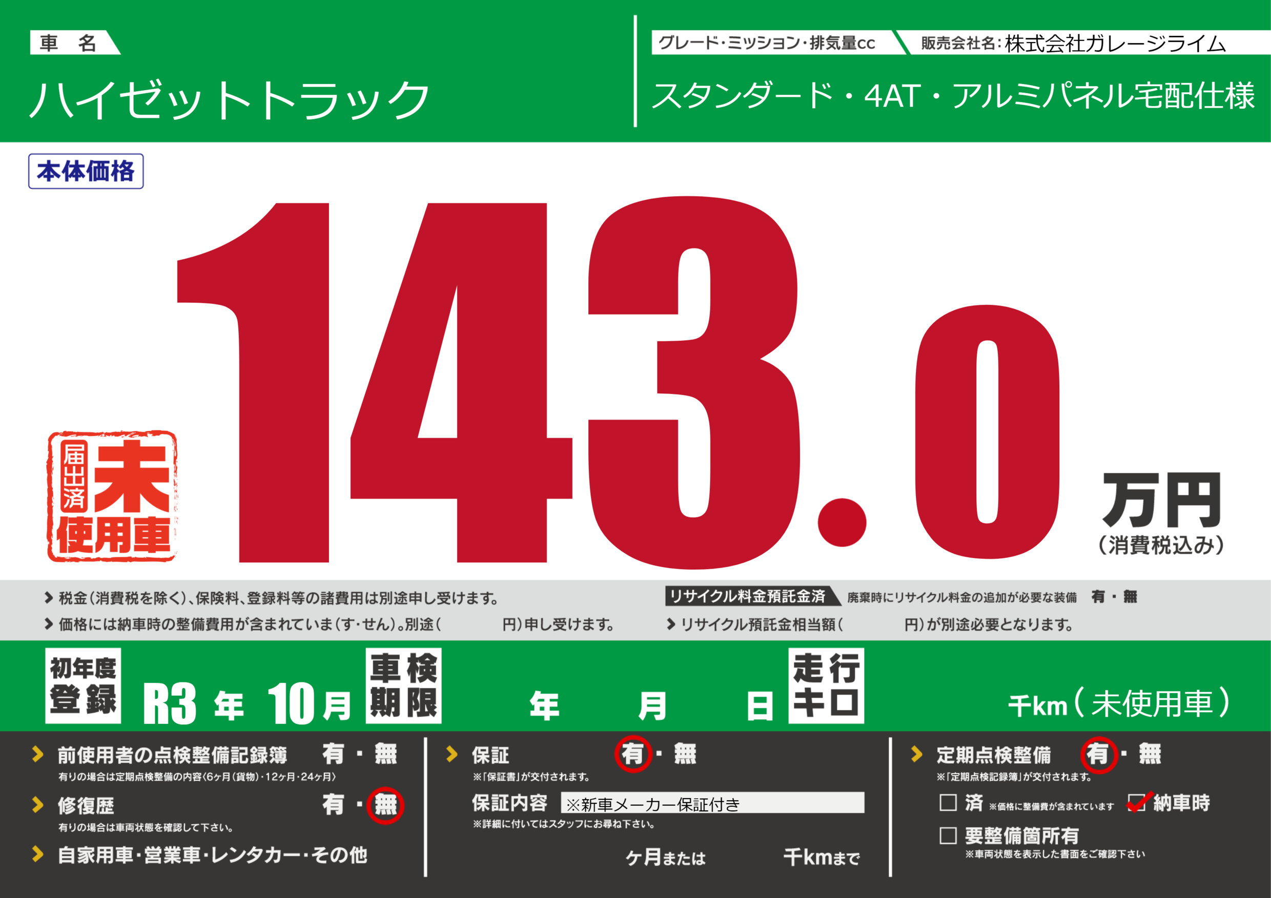 | 車名 | ハイゼットトラック | グレード ミッション 排気量 |