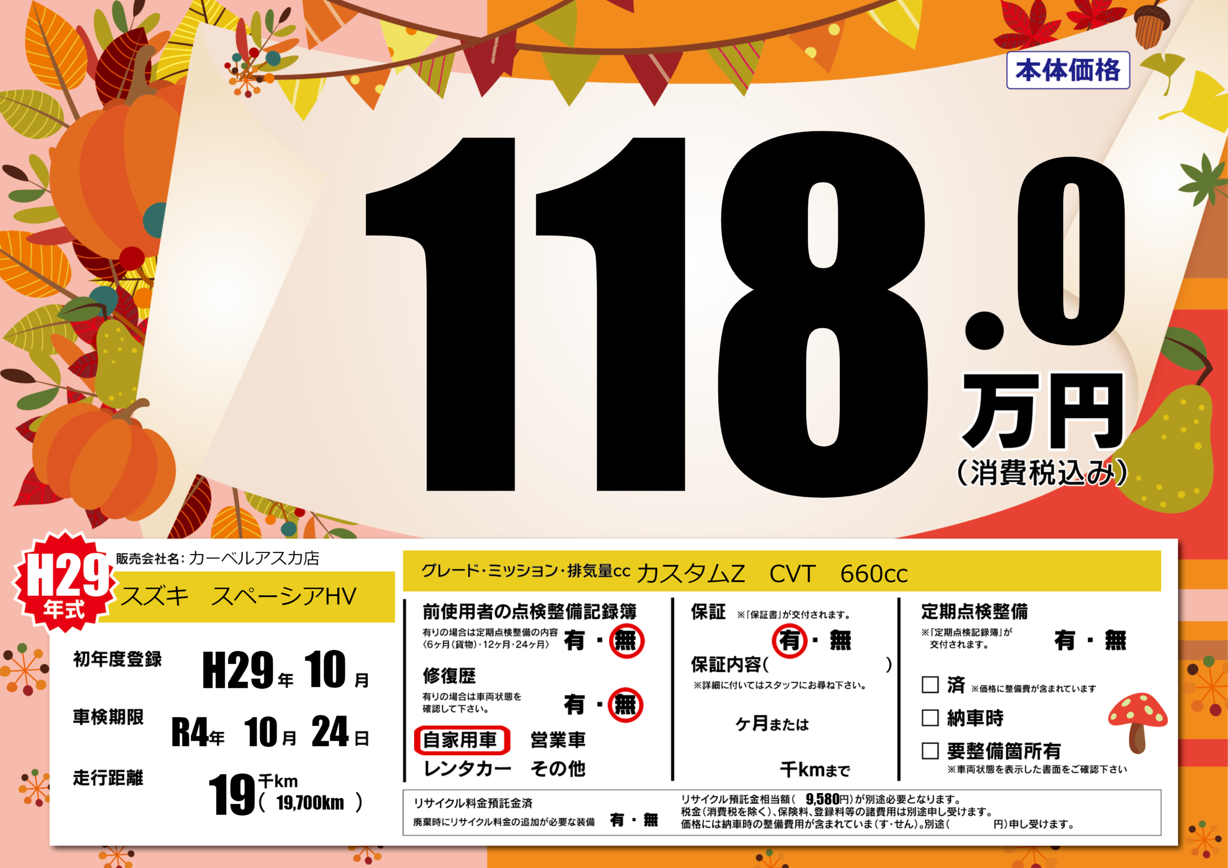 | 走行キロ | 1.9万km | 初年度登録 | H29年10月 |