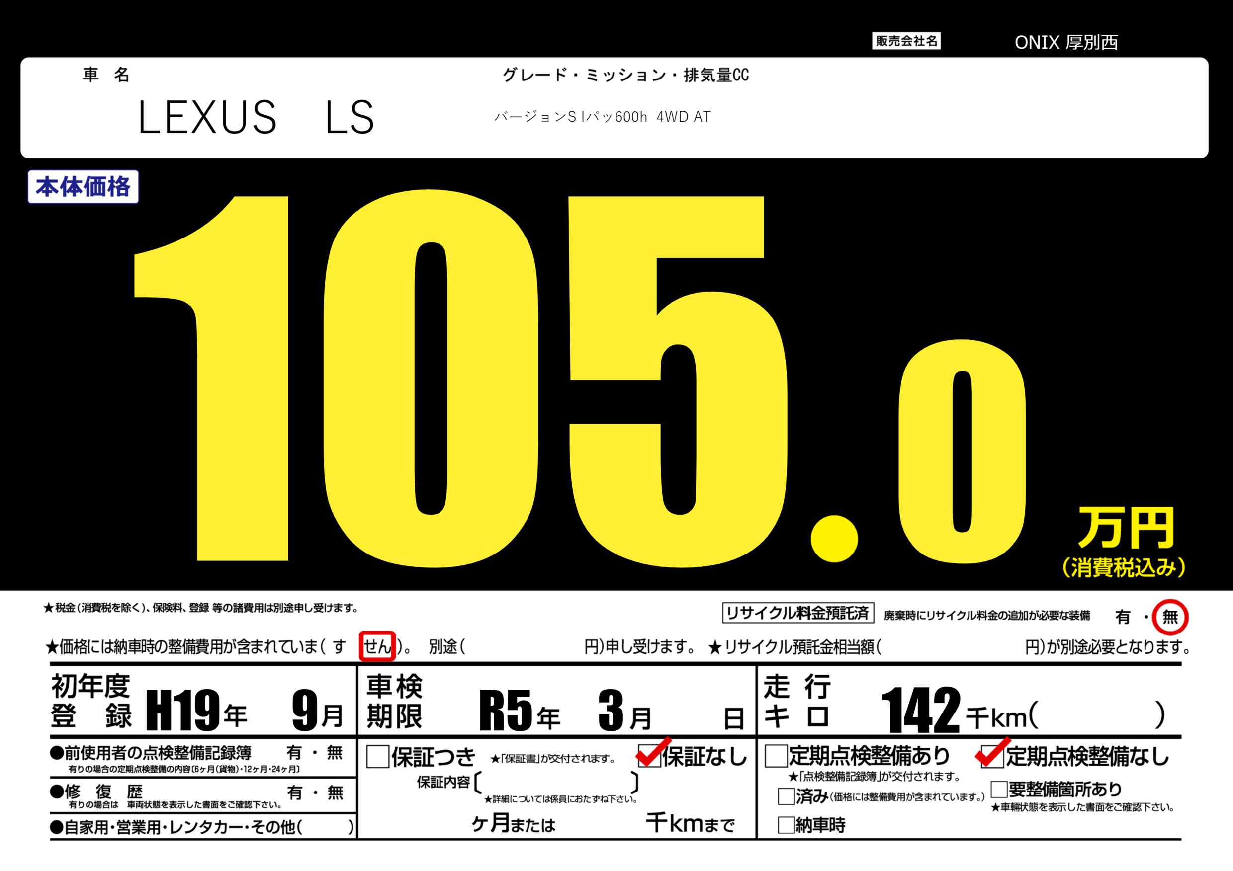 | 車名 | LEXUS LS | グレード ミッション 排気量 |