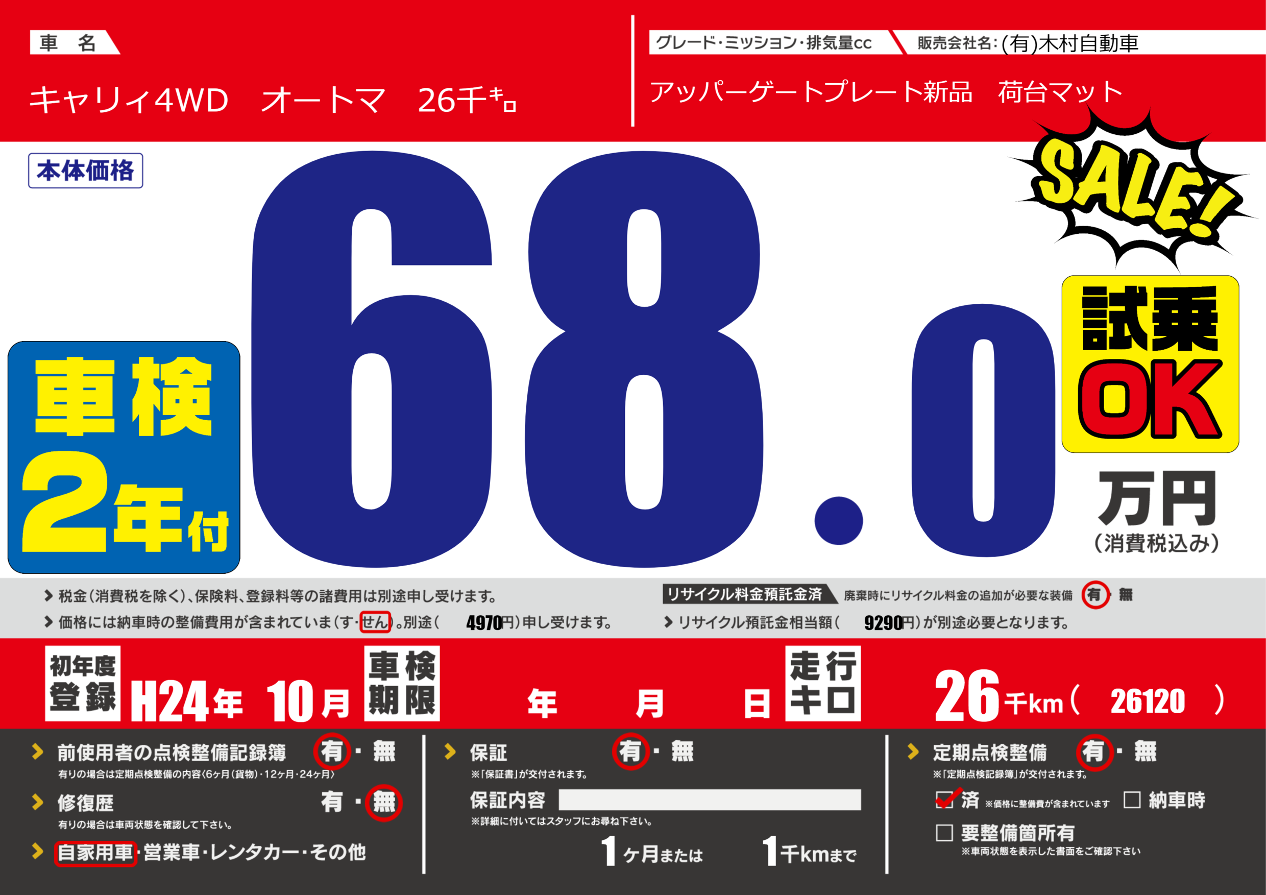 | 車名 | キャリィ4WD オートマ 26千㌔ | グレード ミッション 排気量 |