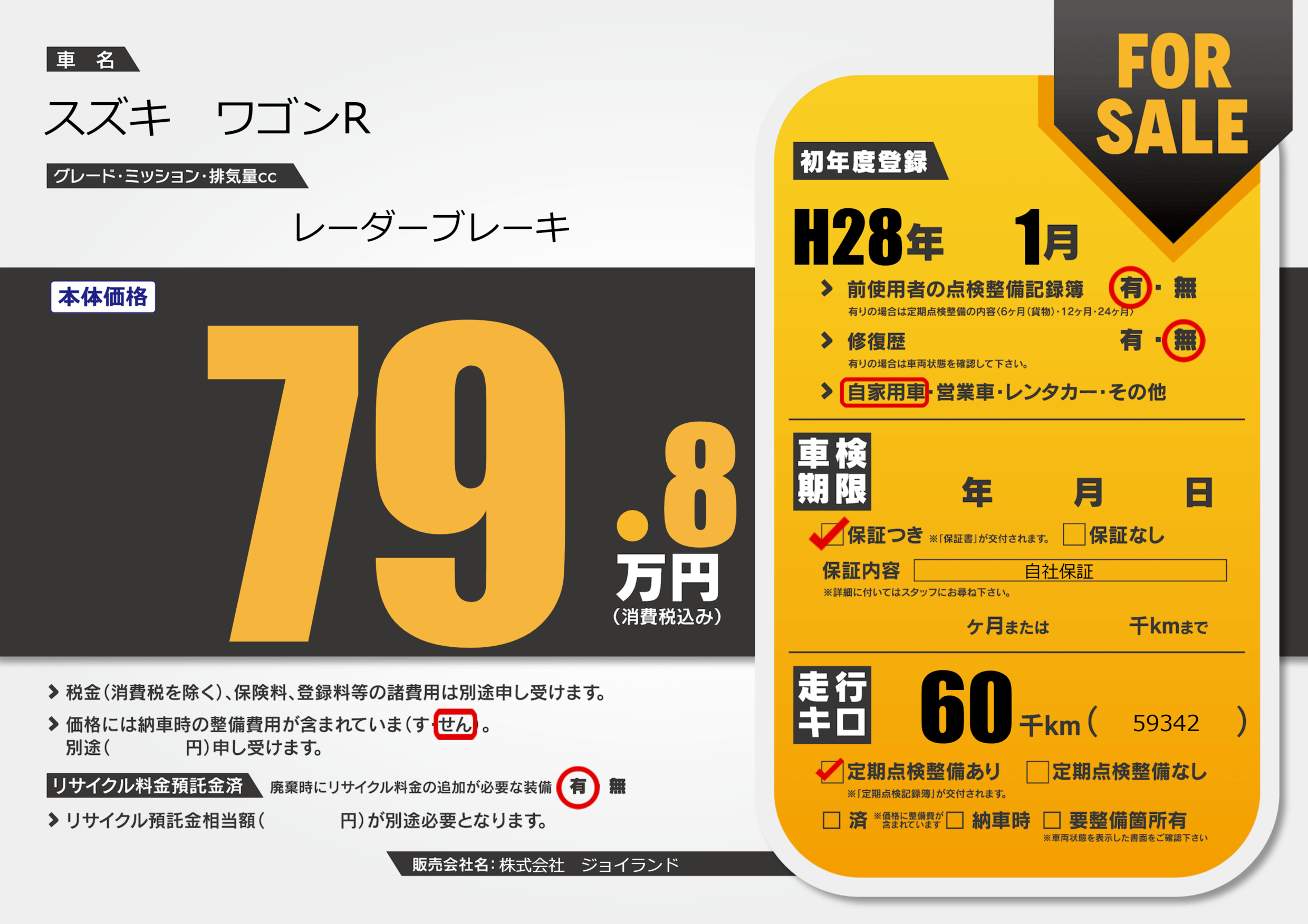 | 車名 | スズキ ワゴンR | グレード ミッション 排気量 |