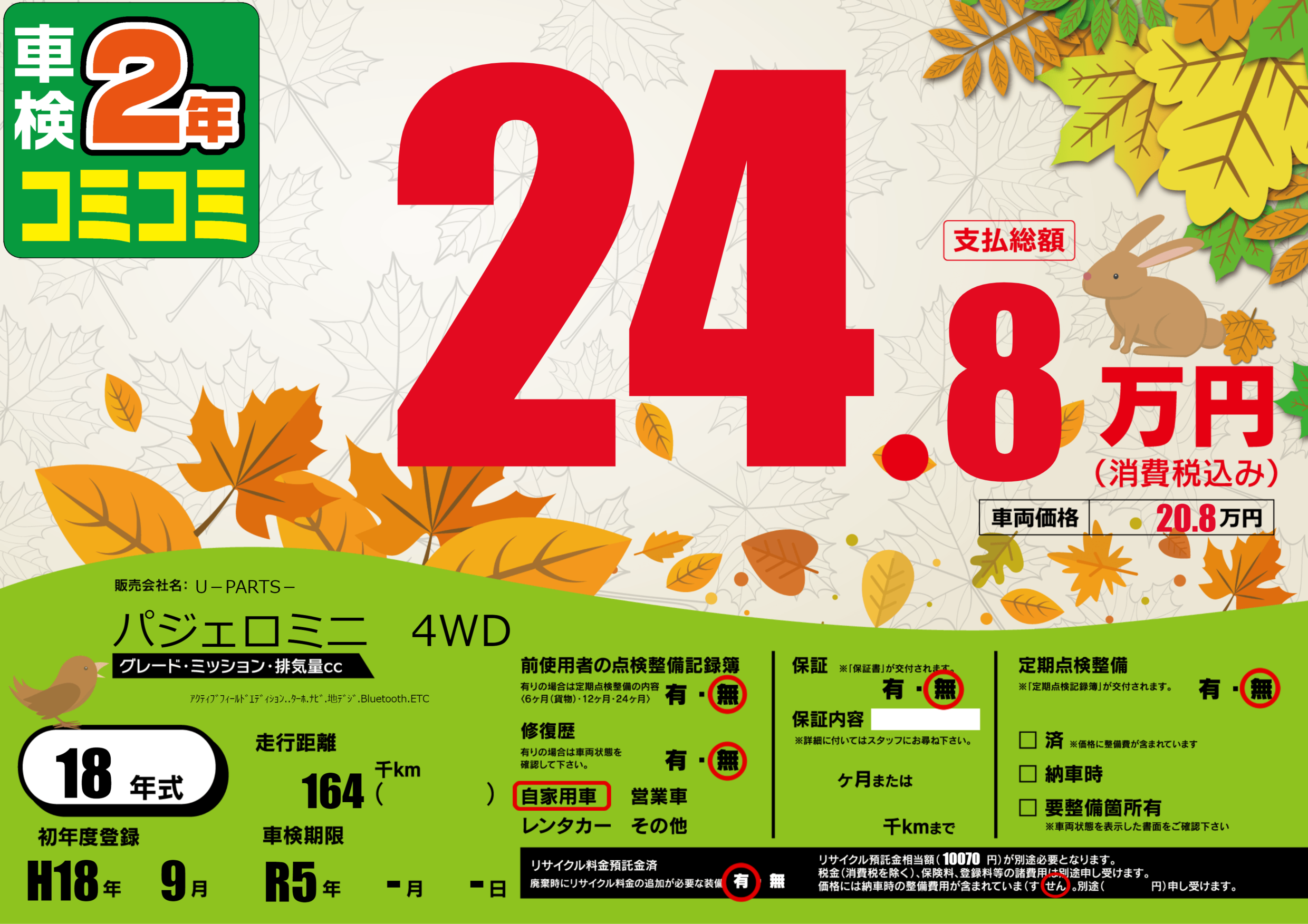 | 車名 | パジェロミニ 4WD | グレード ミッション 排気量 |