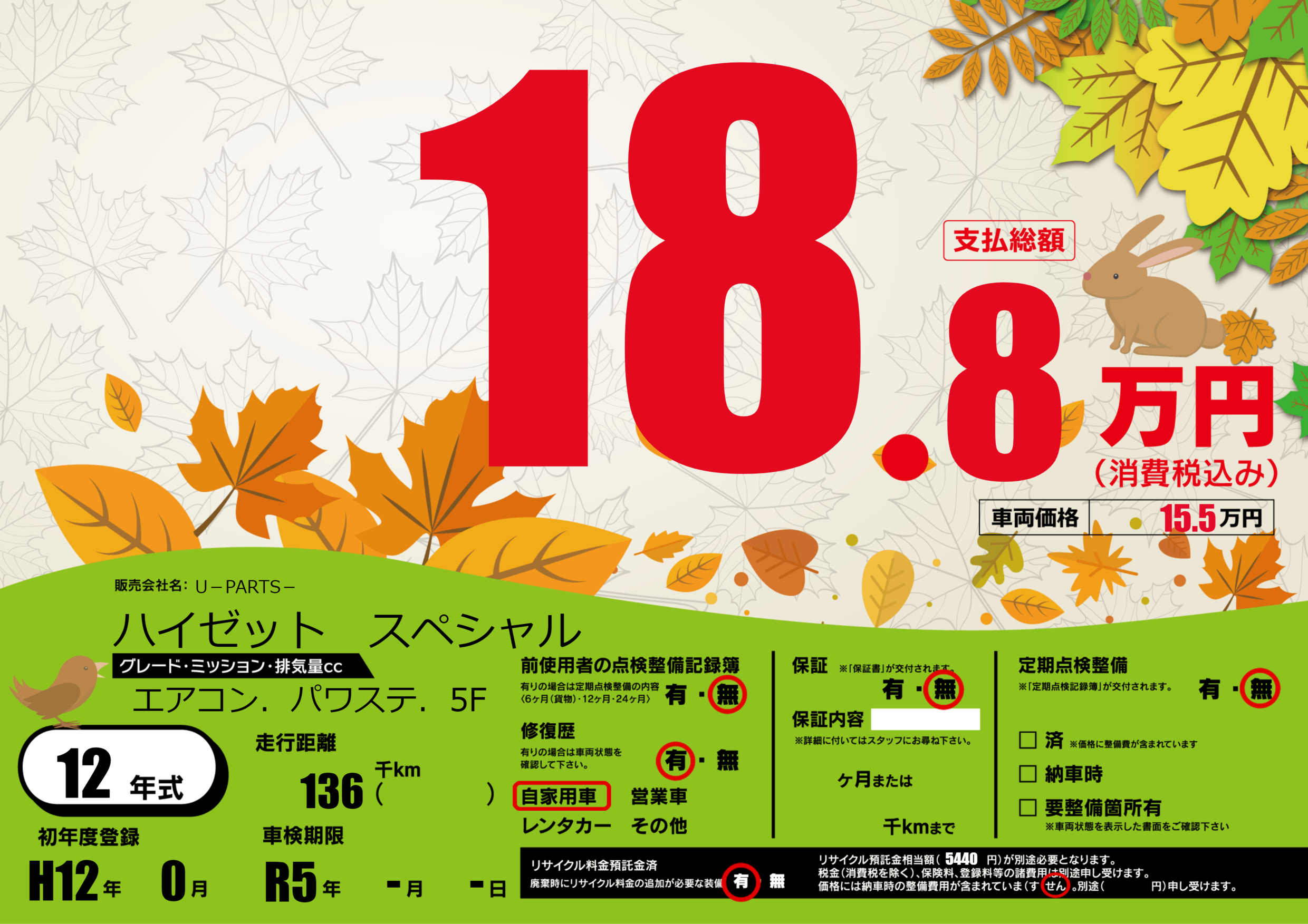 | 車名 | ハイゼット スペシャル | グレード ミッション 排気量 |