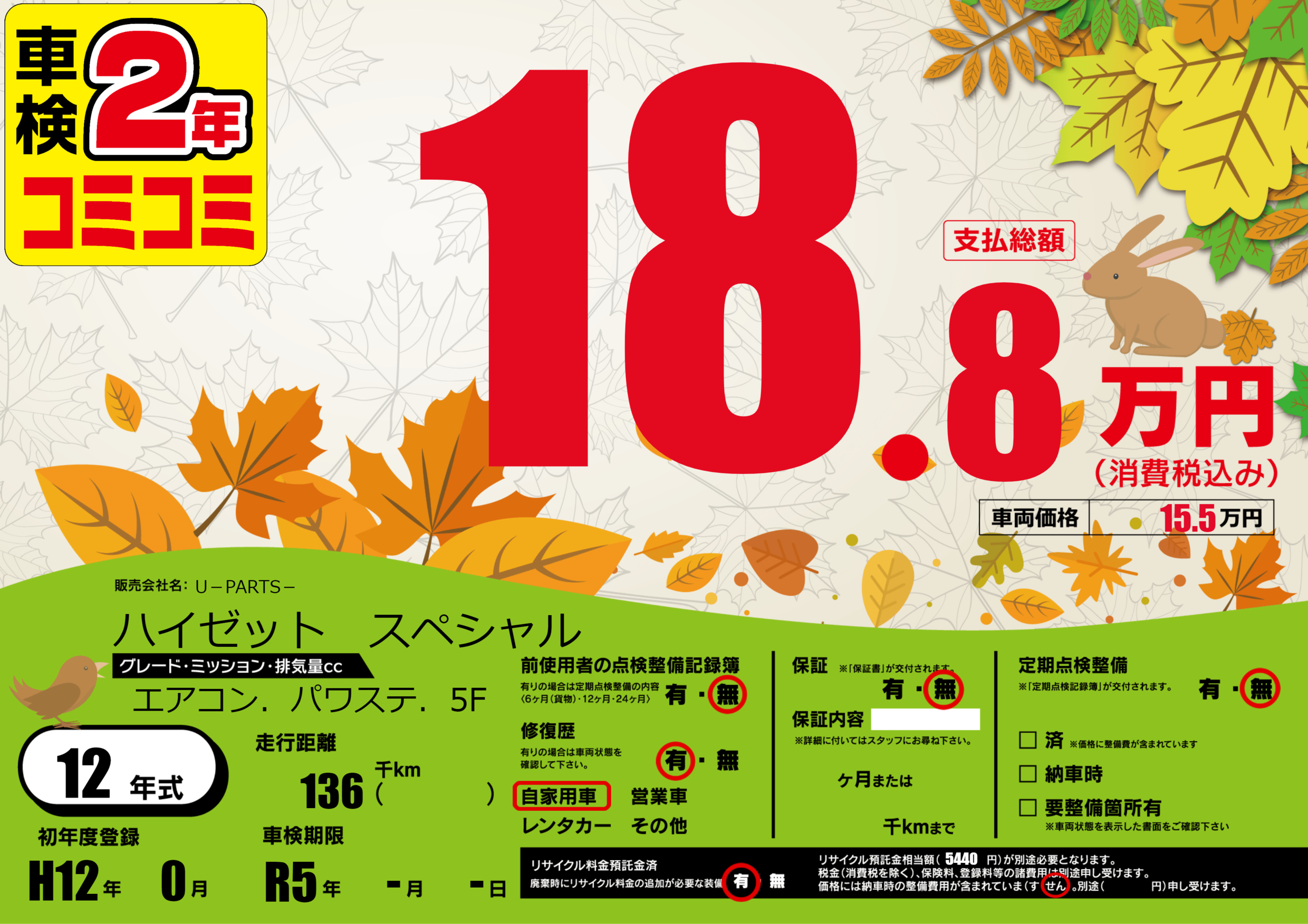 | 車名 | ハイゼット スペシャル | グレード ミッション 排気量 |