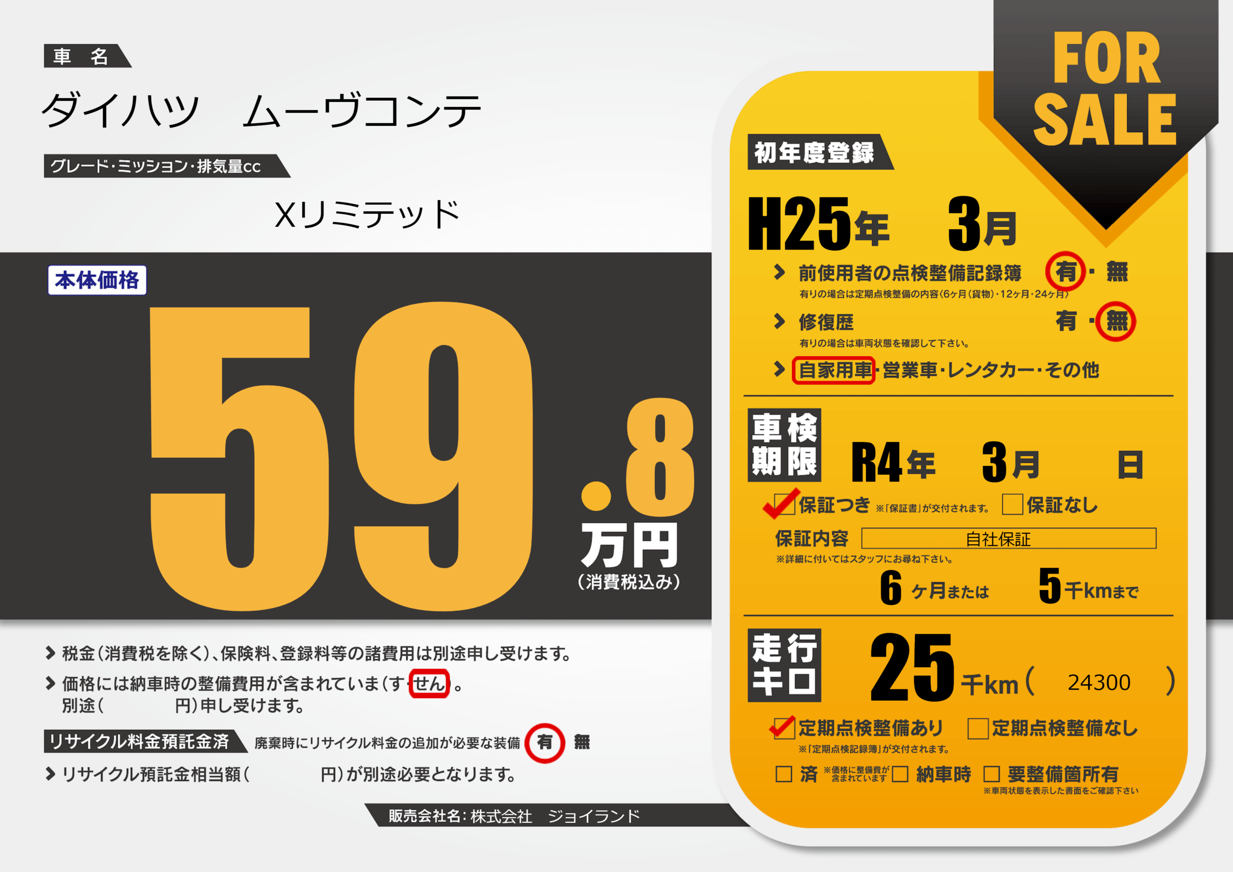 | 車名 | ダイハツ ムーヴコンテ | グレード ミッション 排気量 |