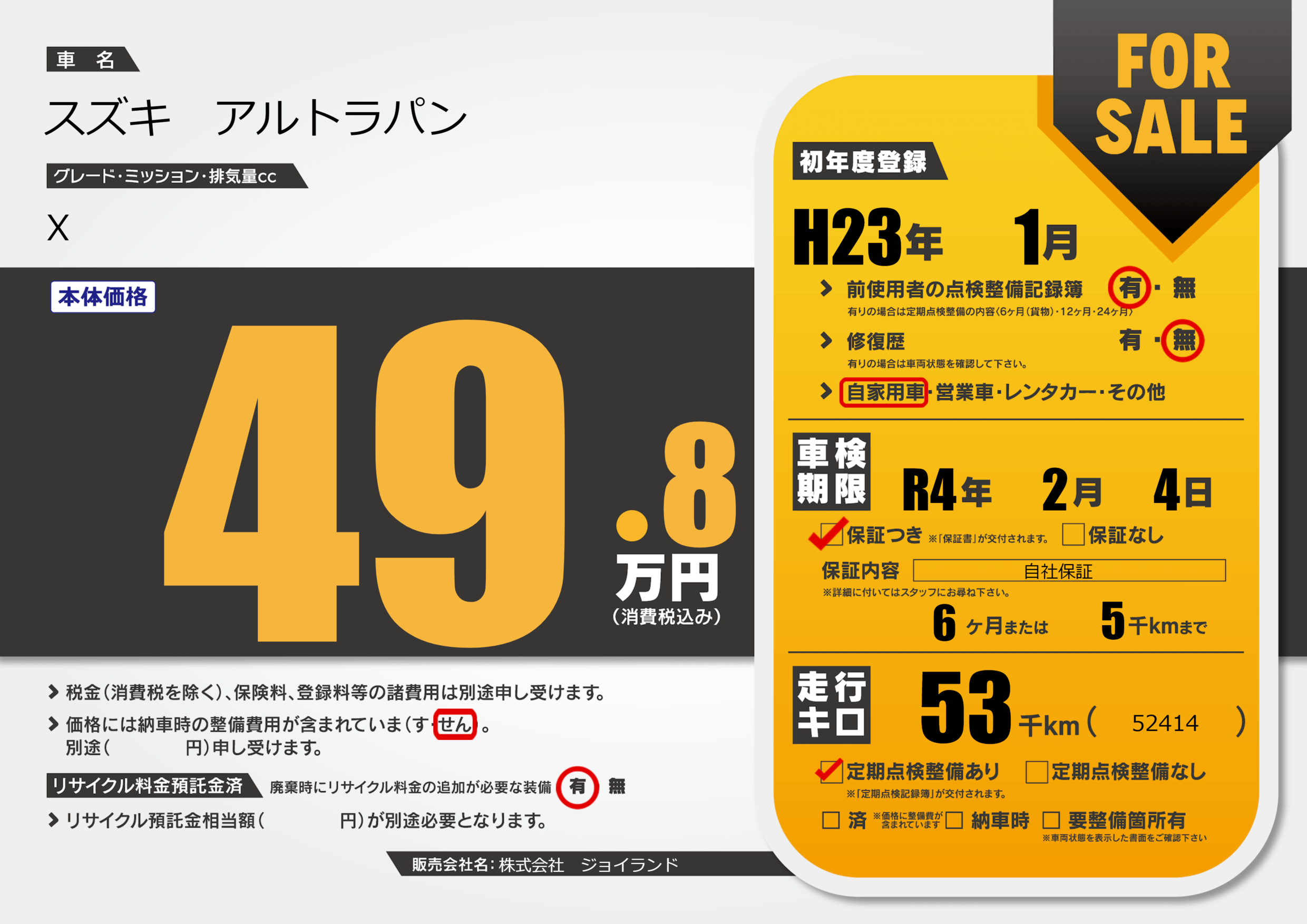 | 走行キロ | 5.3万km | 初年度登録 | H23年1月 |