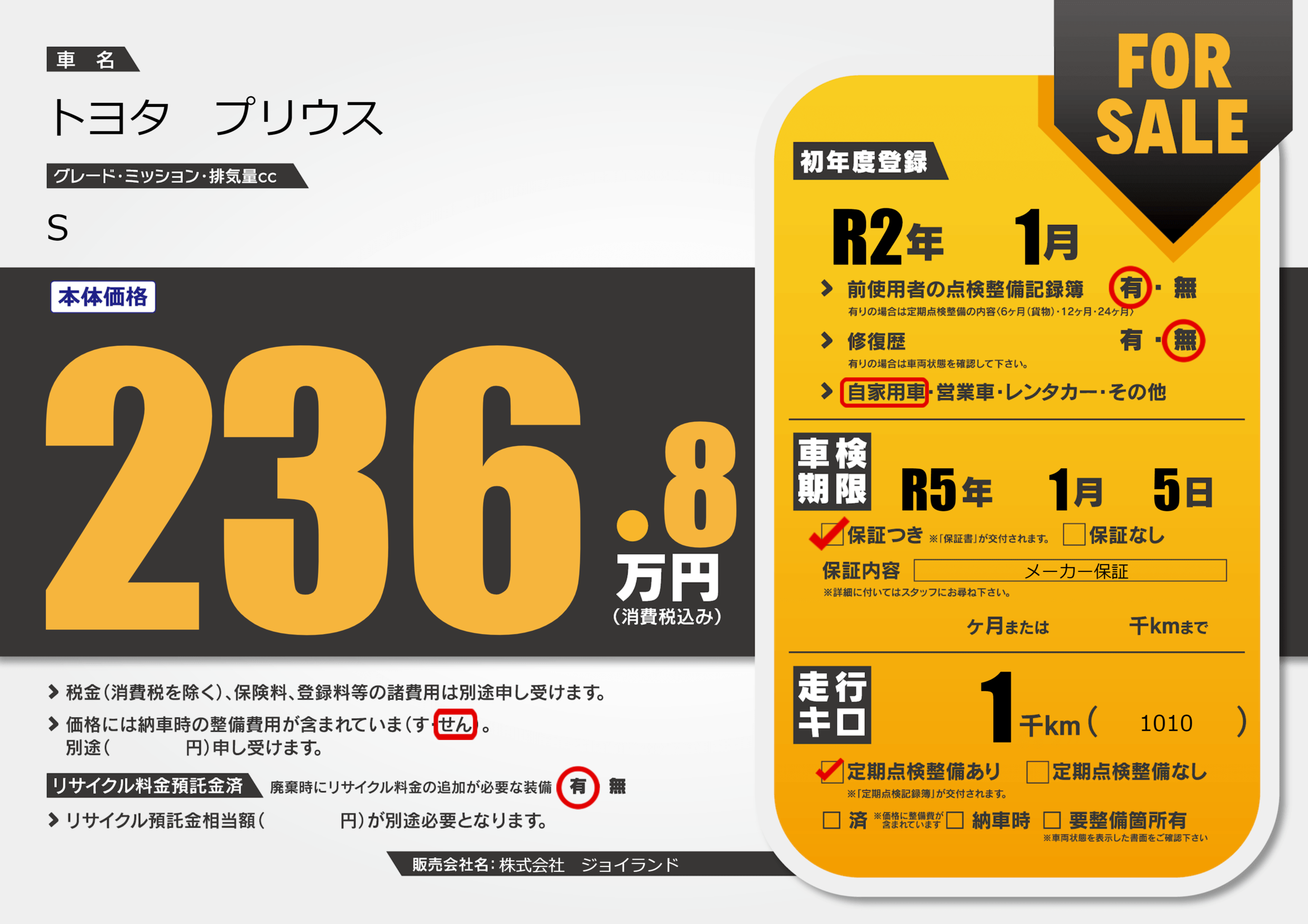 | 車名 | トヨタ プリウス | グレード ミッション 排気量 |