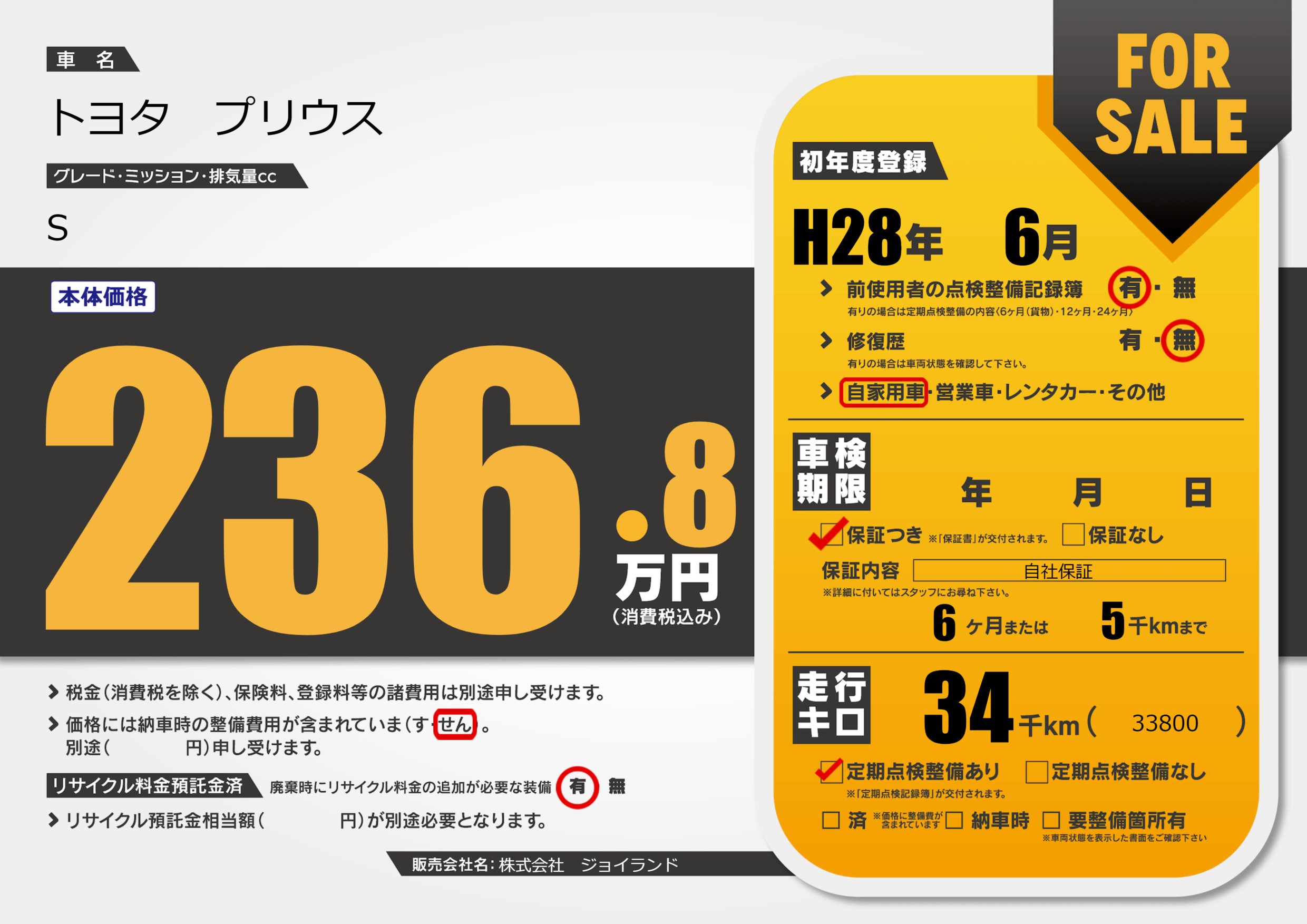 | 車名 | トヨタ プリウス | グレード ミッション 排気量 |