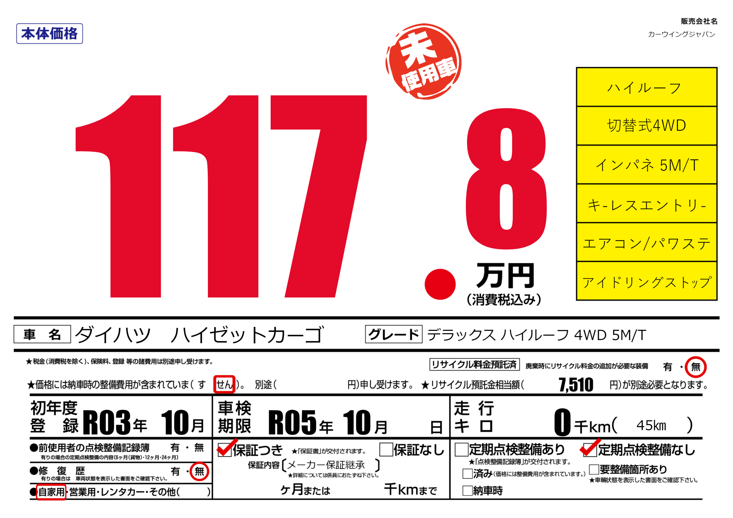| 車名 | ダイハツ ハイゼットカーゴ | グレード ミッション 排気量 |