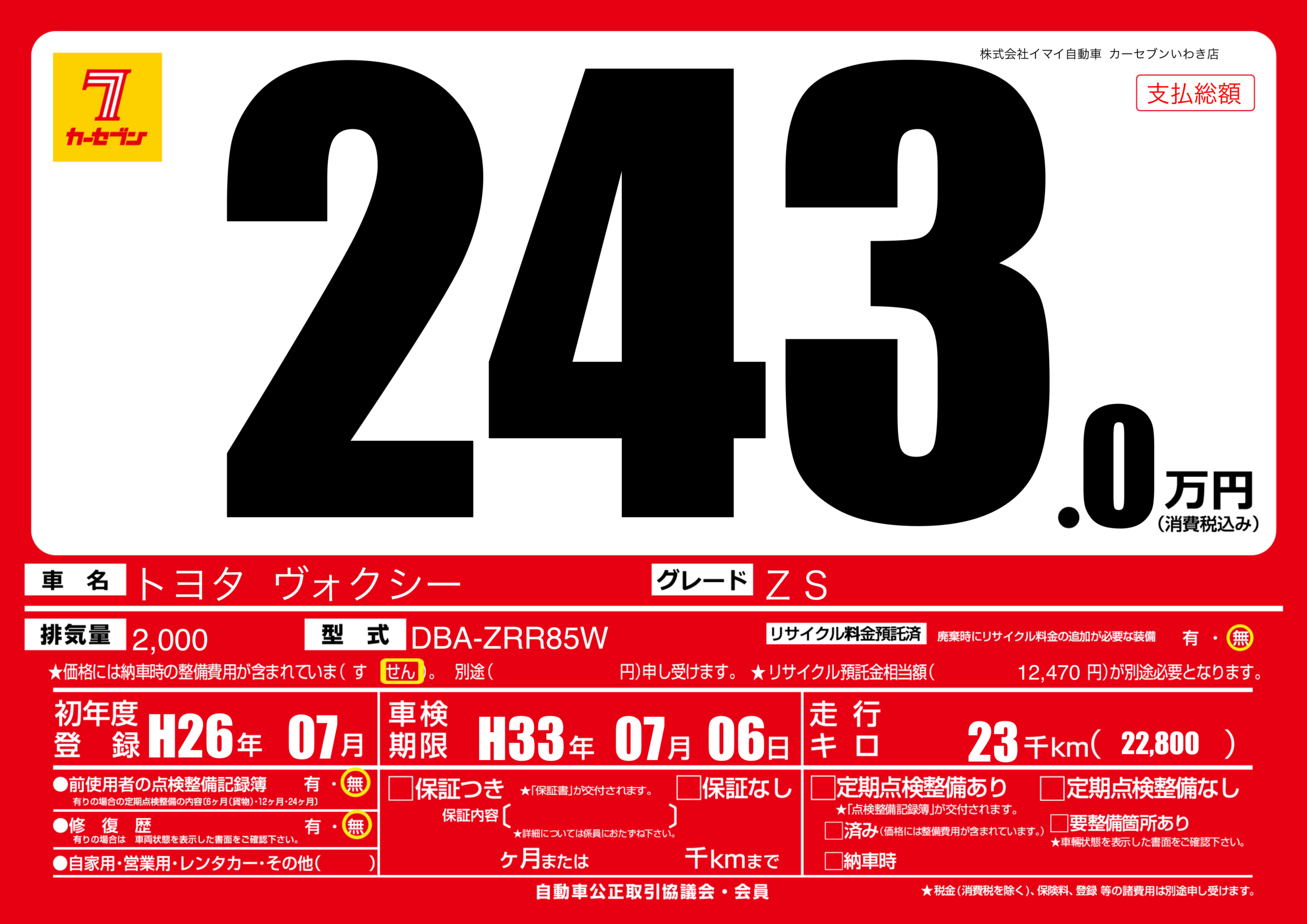 | 走行キロ | 2.3万km | 初年度登録 | H26年07月 |