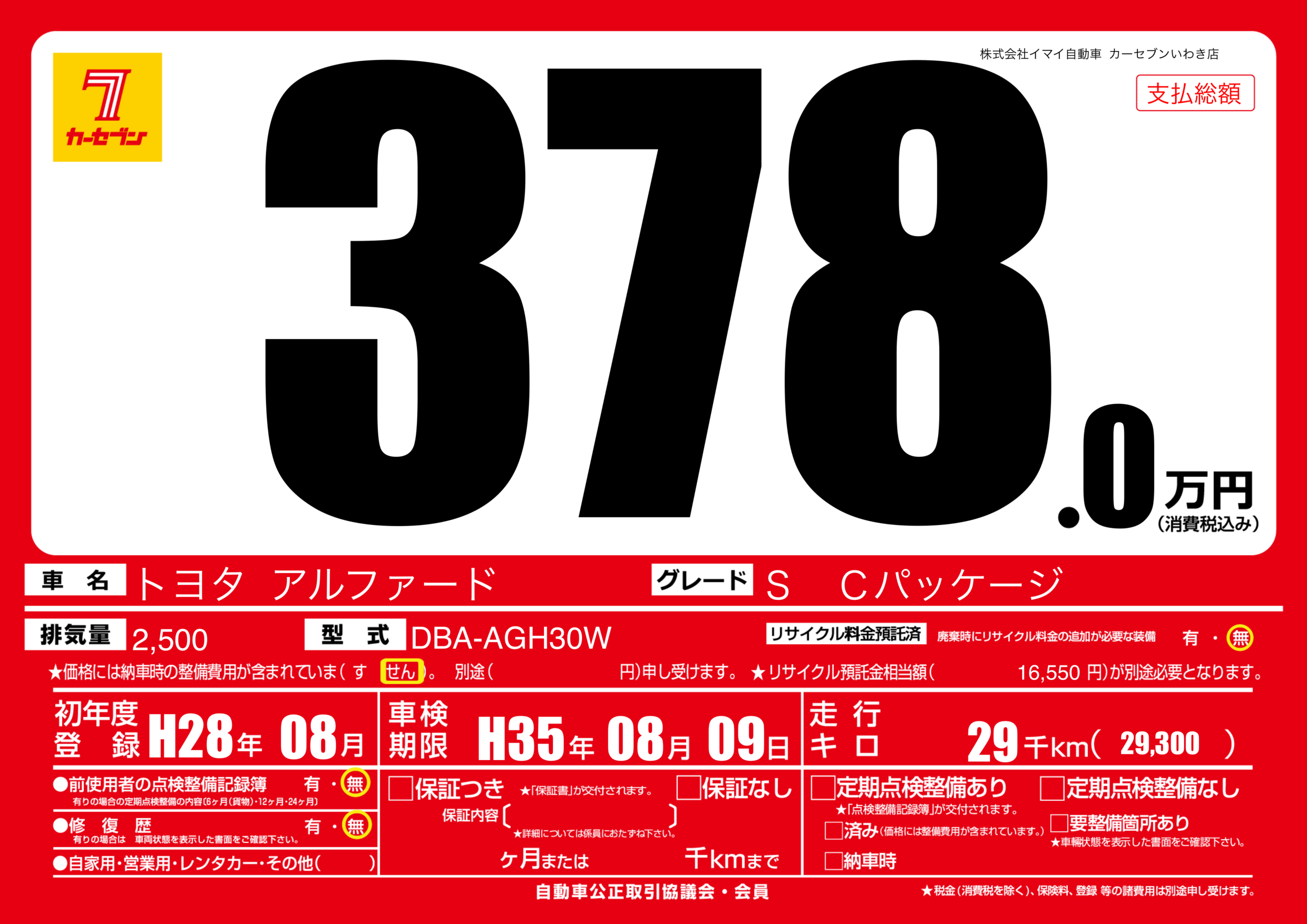 | 車名 | トヨタ アルファード | グレード ミッション 排気量 |