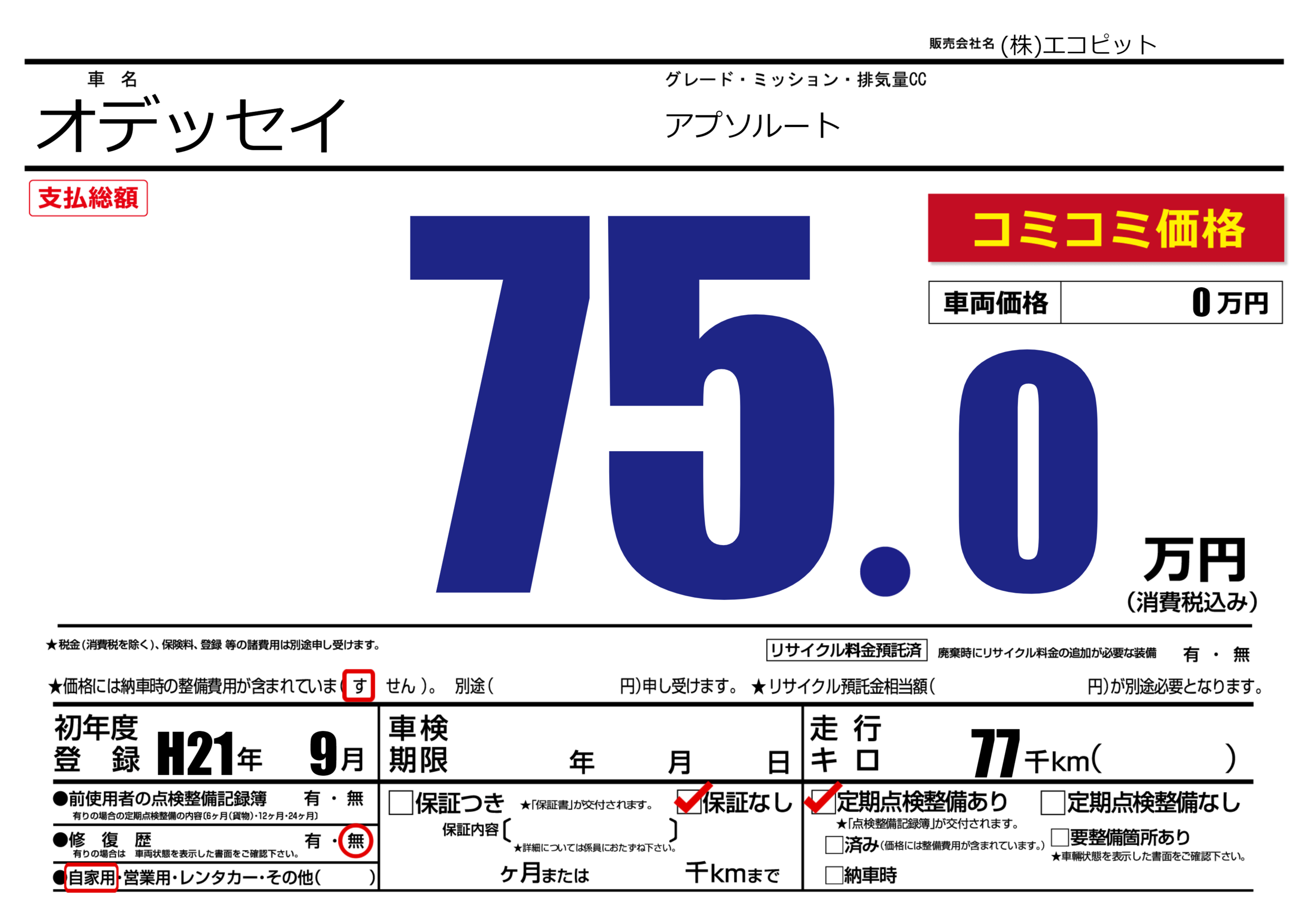 | 走行キロ | 7.7万km | 初年度登録 | H21年9月 |