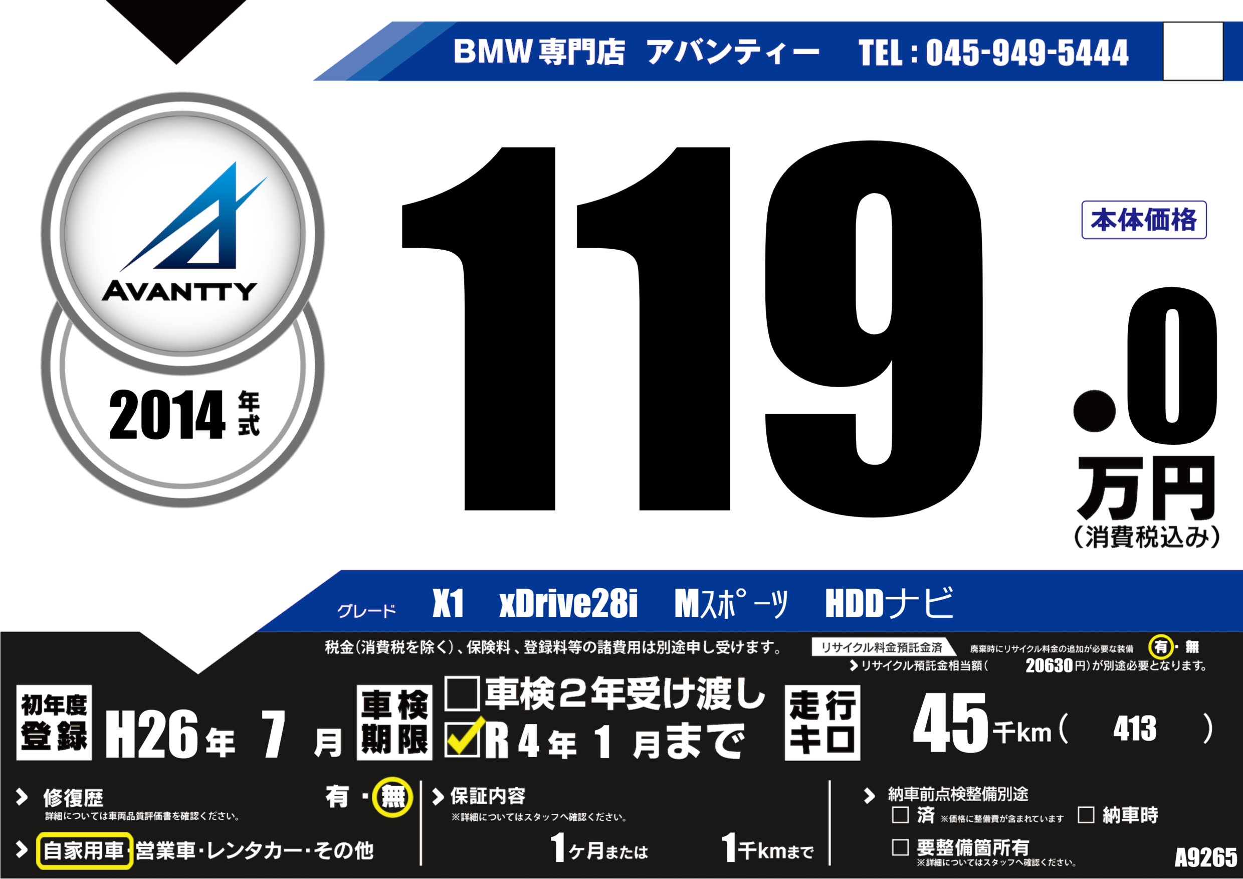 | 走行キロ | 4.5万km | 初年度登録 | H26年7月 |