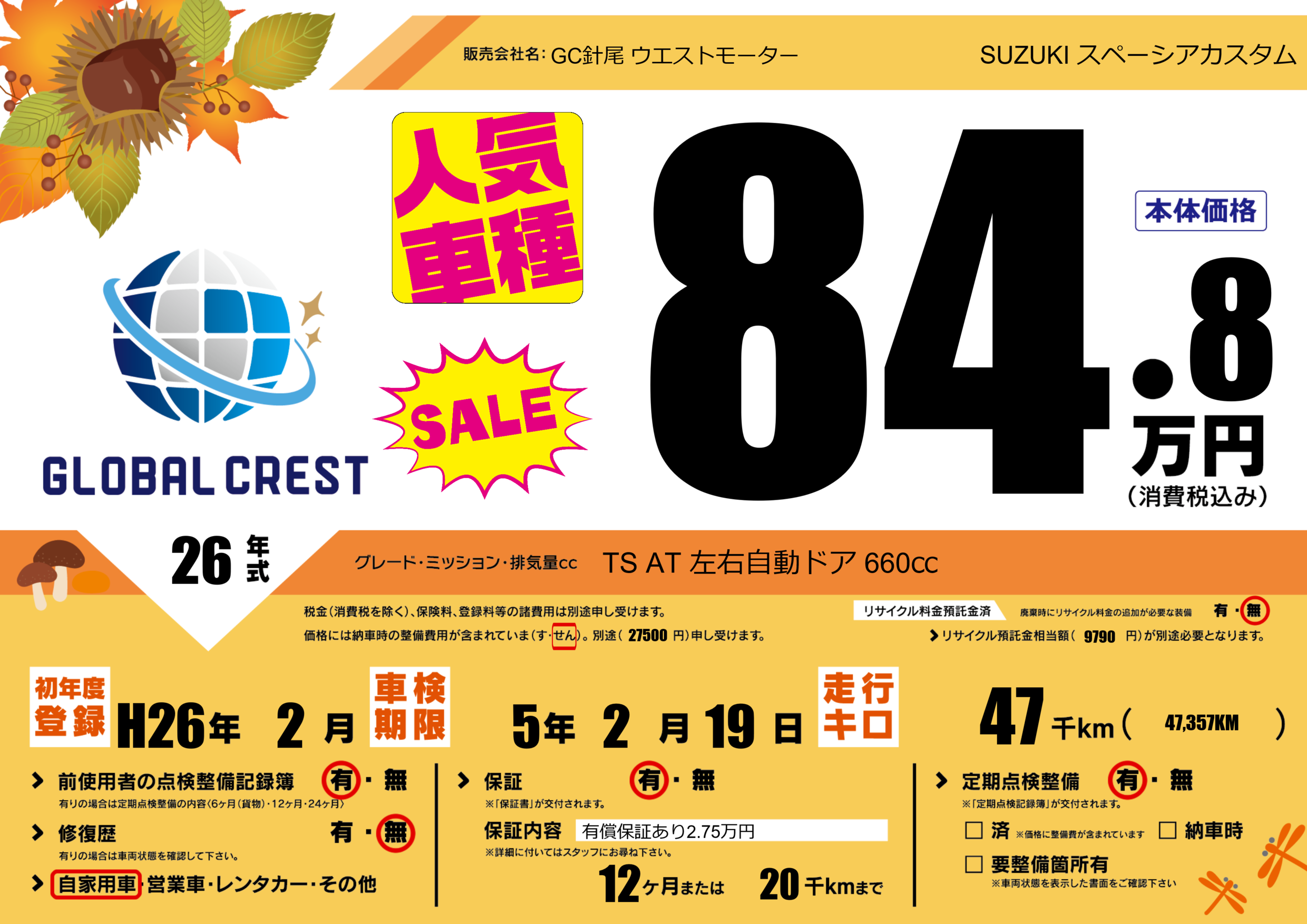 | 車名 | SUZUKI スペーシアカスタム | グレード ミッション 排気量 |