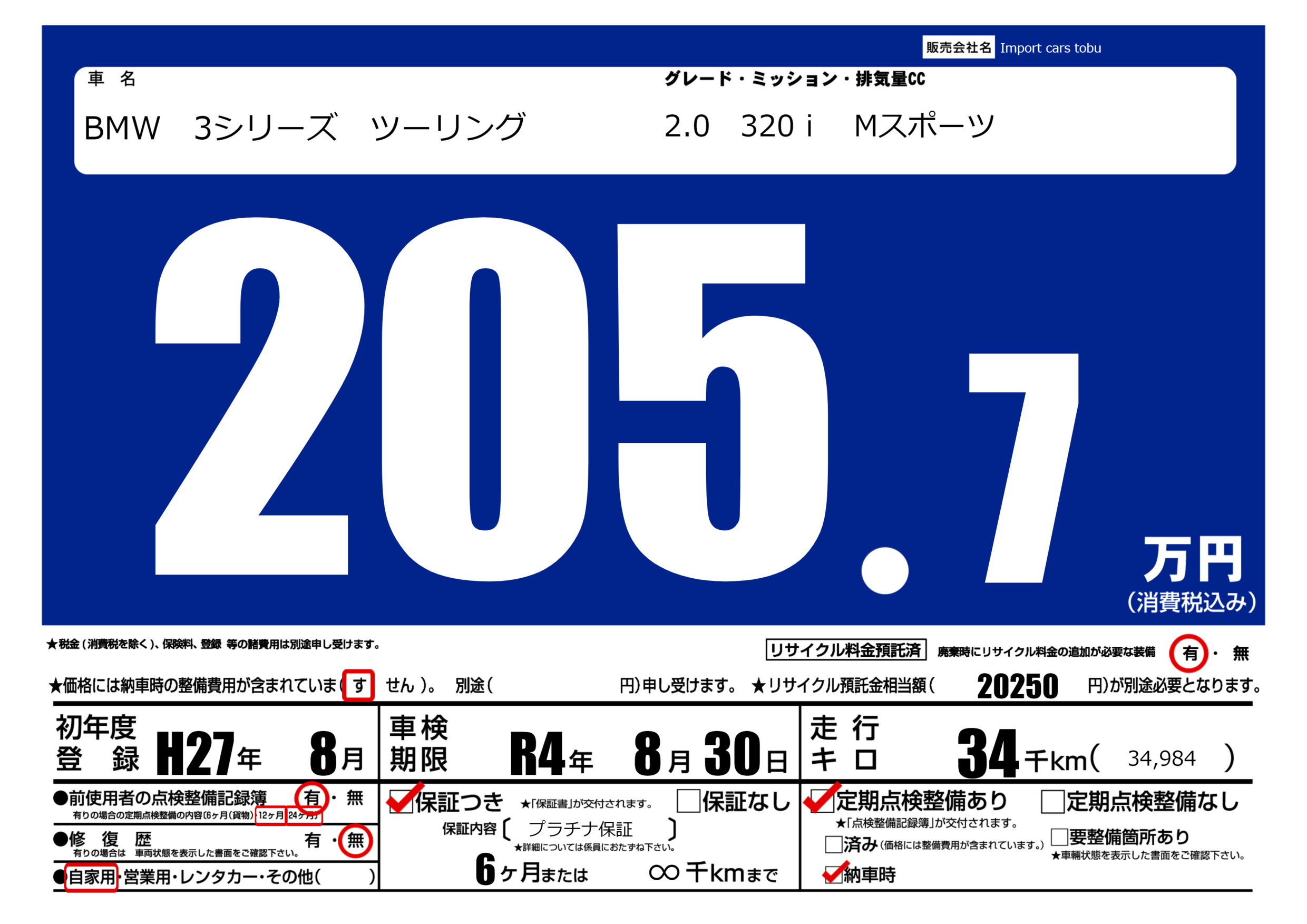 | 車名 | BMW 3シリーズ ツーリング | グレード ミッション 排気量 |
