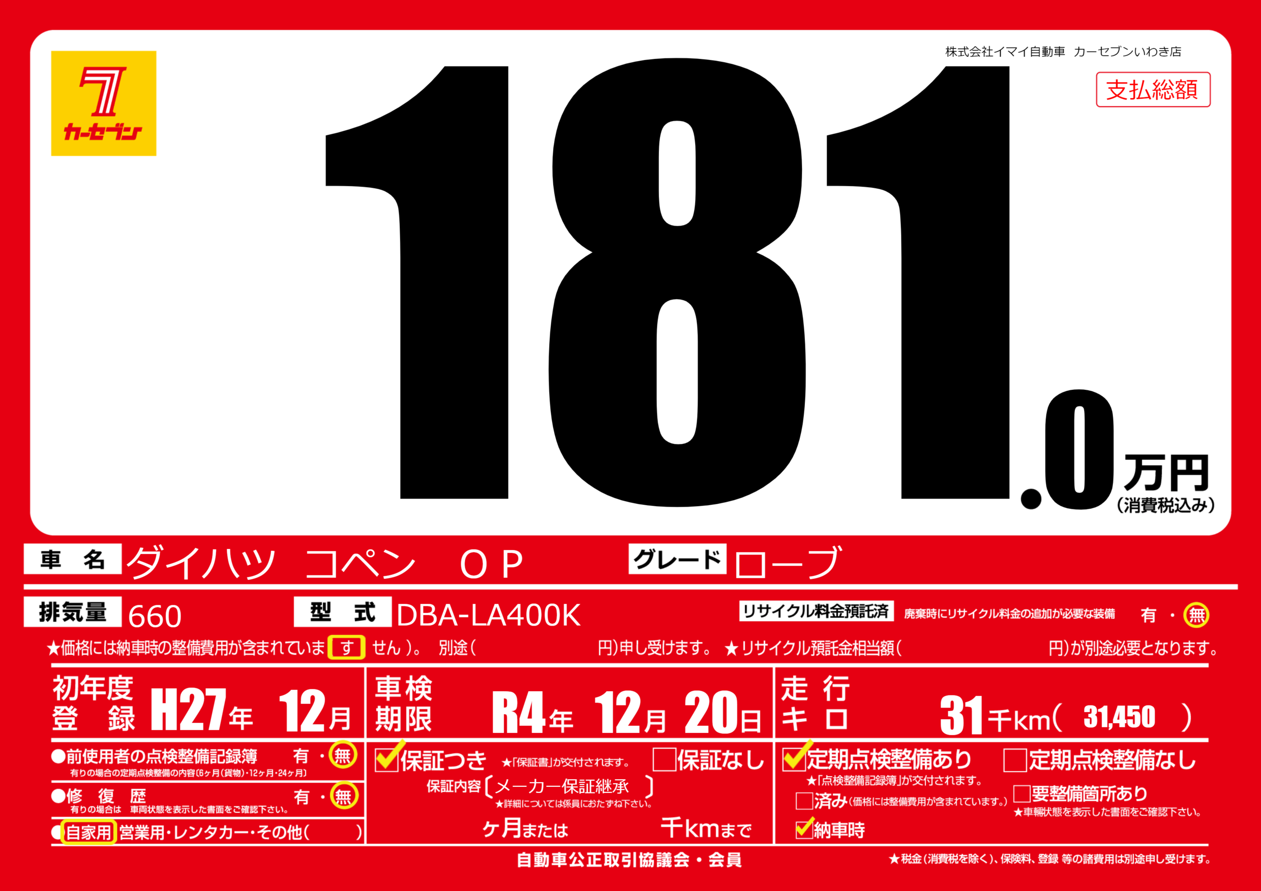 | 車名 | ダイハツ コペン OP | グレード ミッション 排気量 |