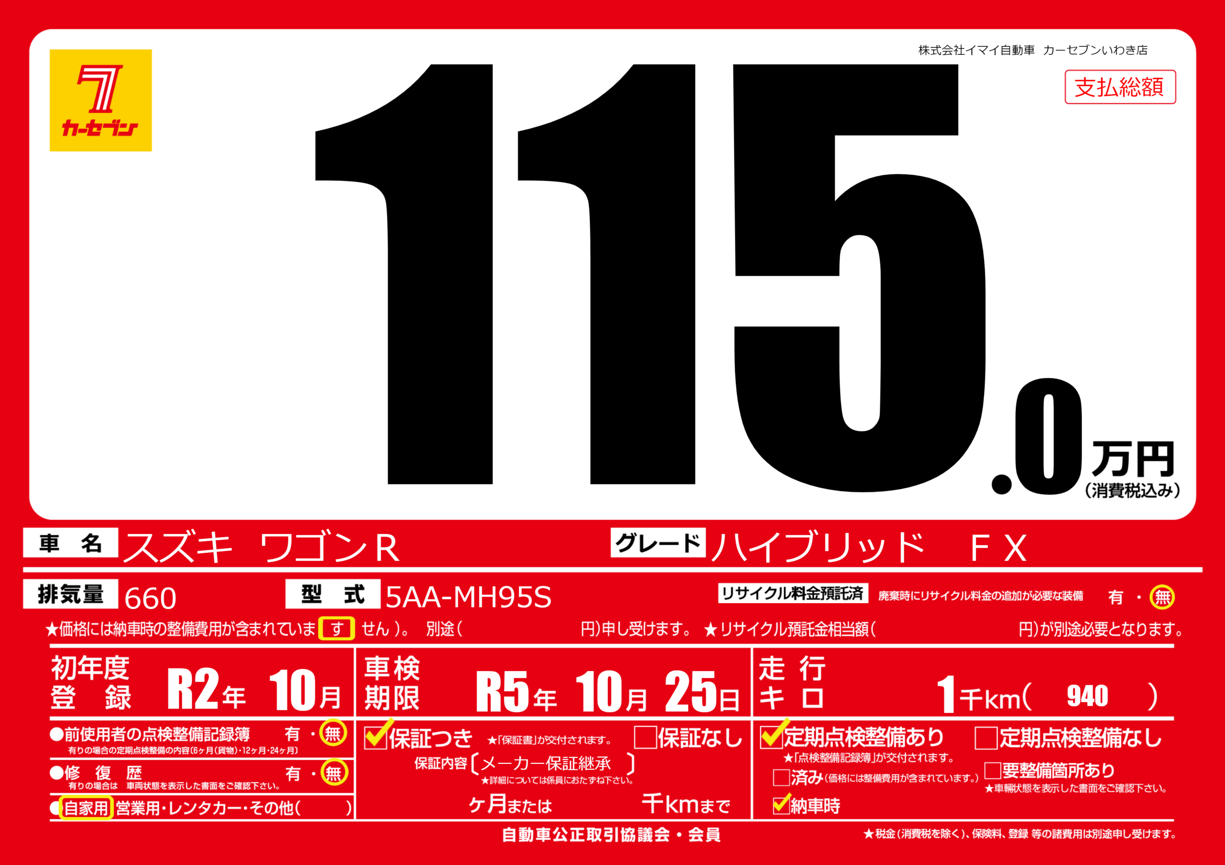 | 車名 | スズキ ワゴンR | グレード ミッション 排気量 |