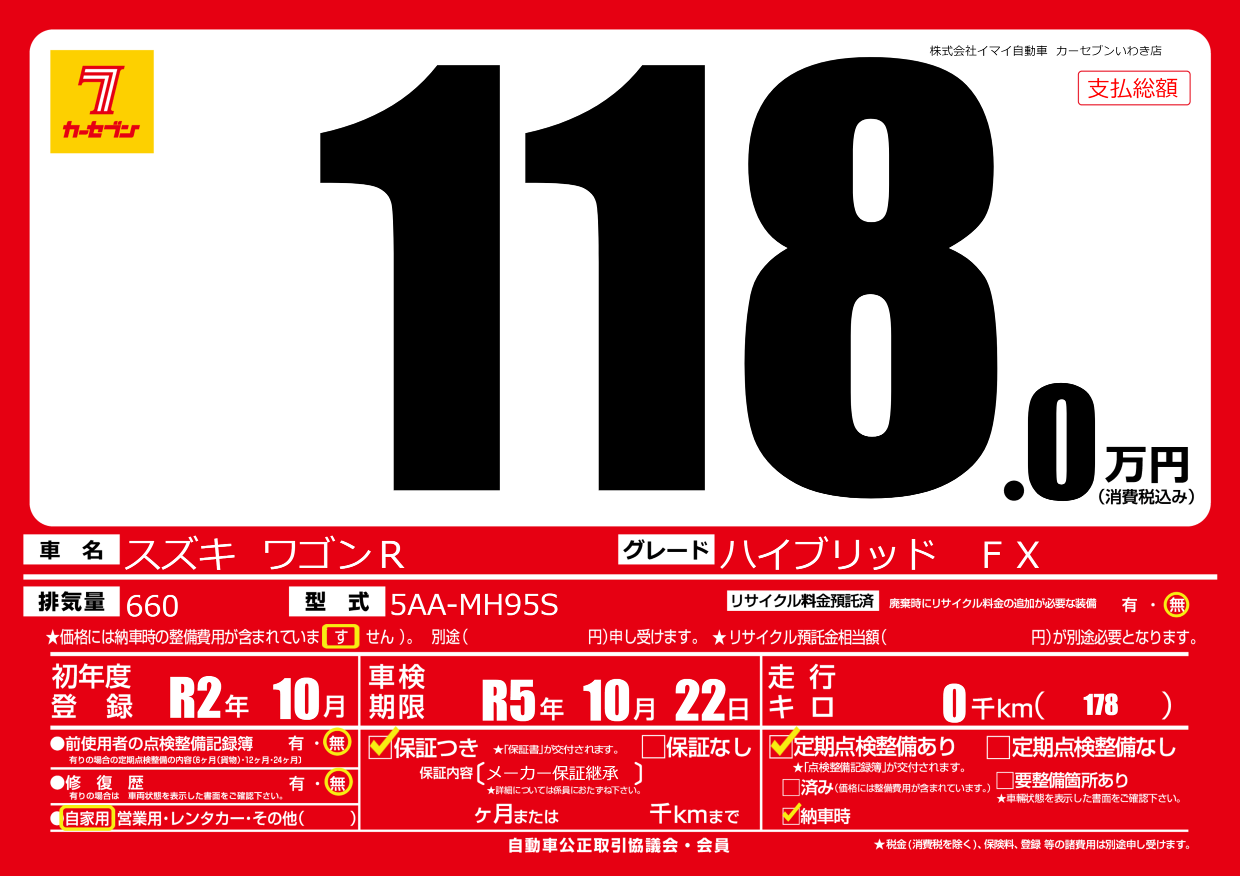 保証付き 保証内容(メーカー保証継承) ---ヶ月または()千kmまで |