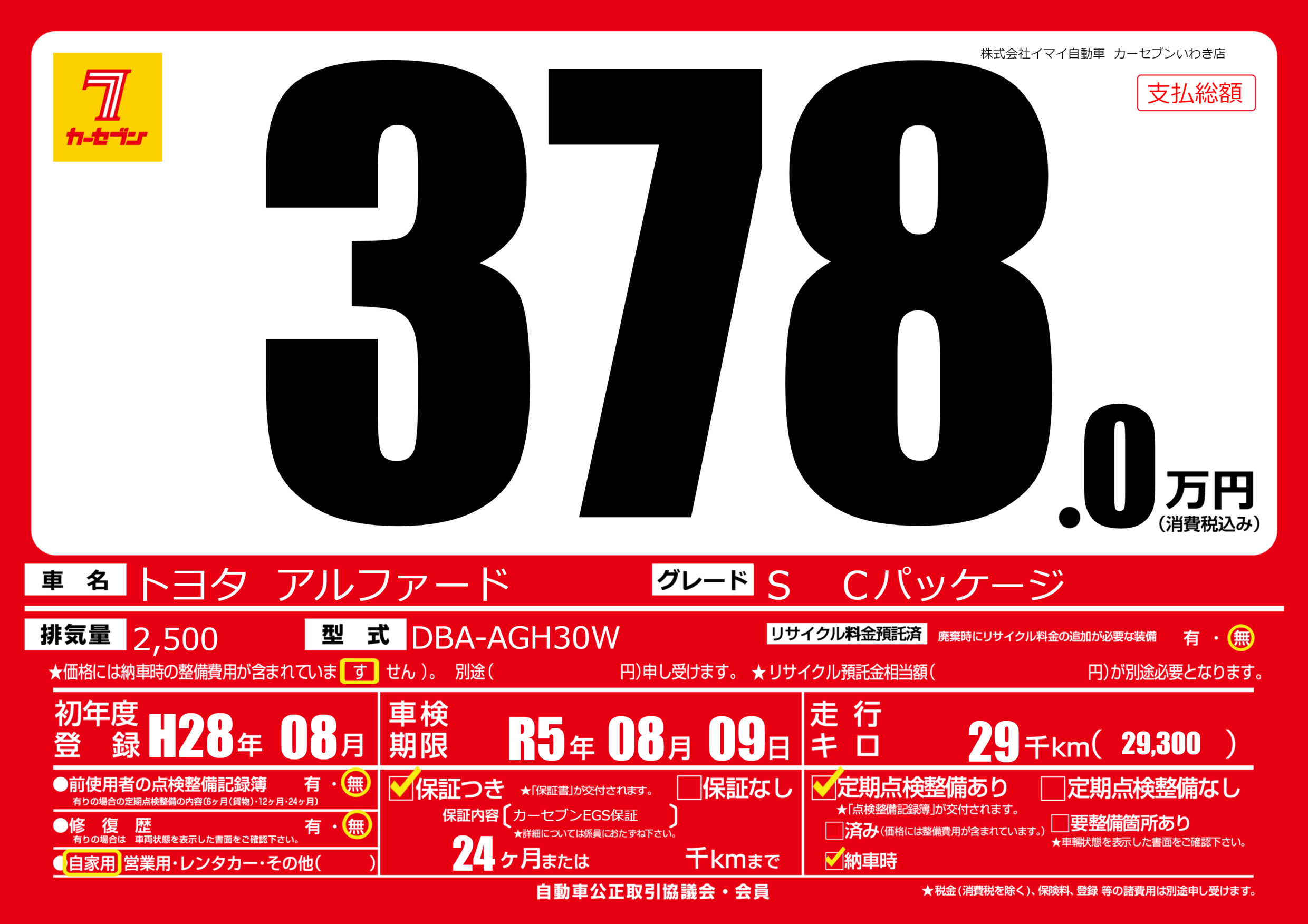 | 車名 | トヨタ アルファード | グレード ミッション 排気量 |