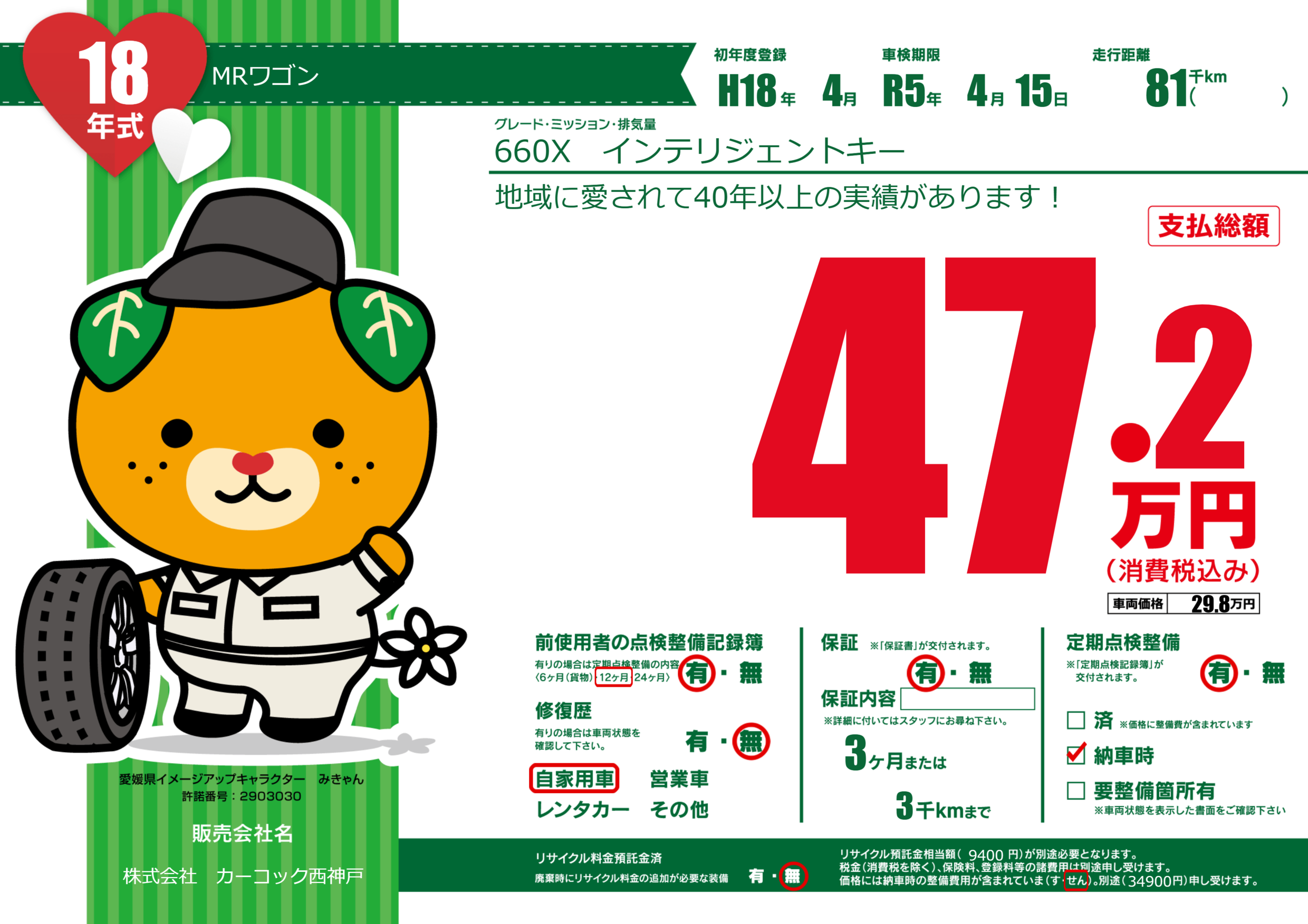 | 車名 | MRワゴン | グレード ミッション 排気量 |