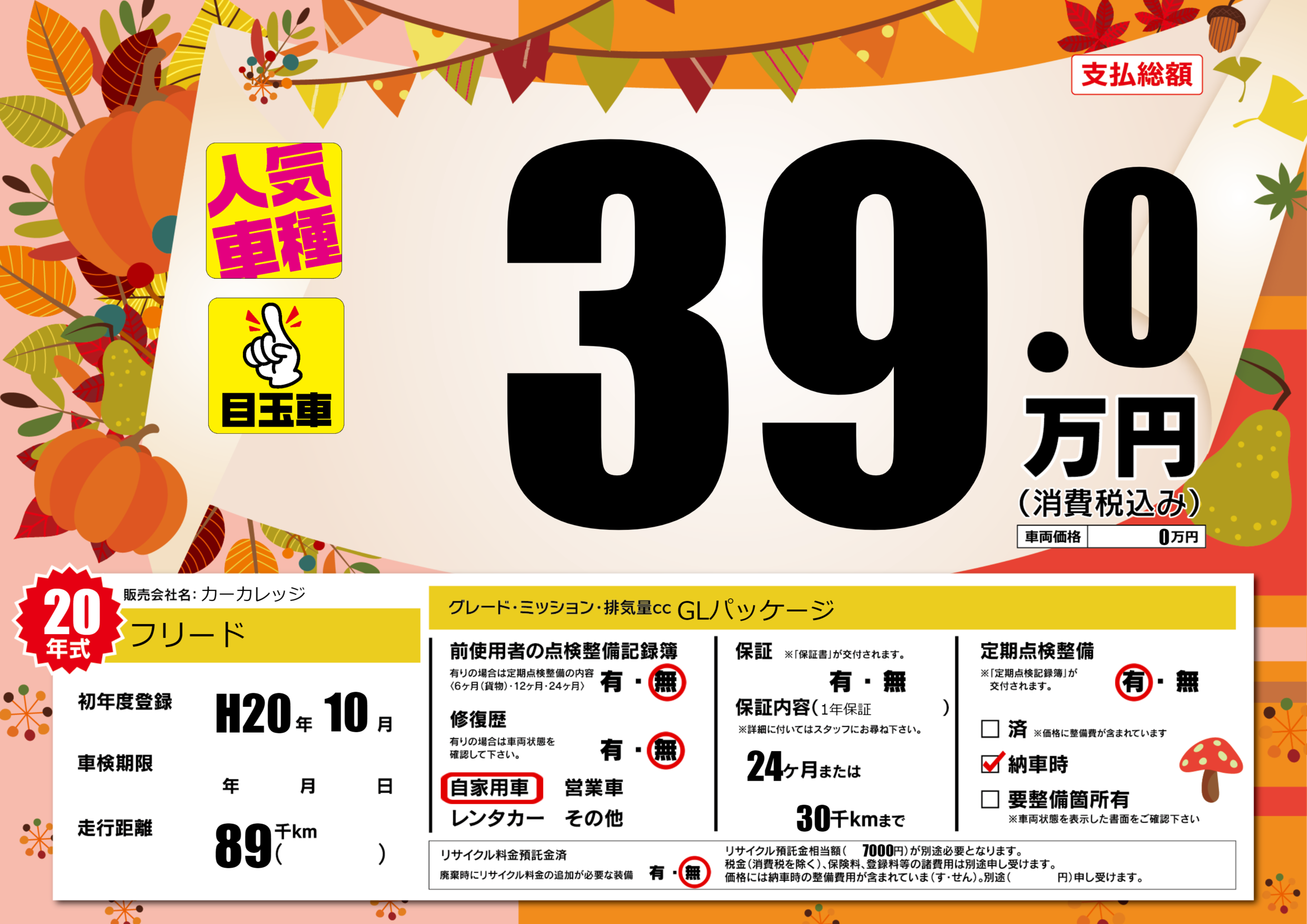 | 走行キロ | 8.9万km | 初年度登録 | H20年10月 |