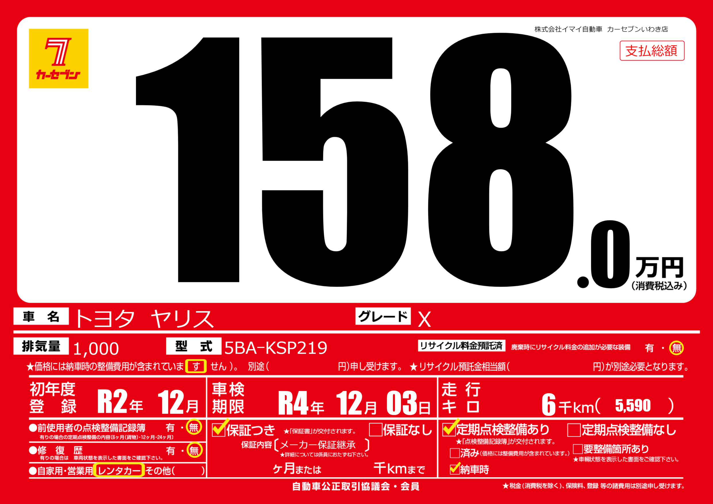| 車名 | トヨタ ヤリス | グレード ミッション 排気量 |