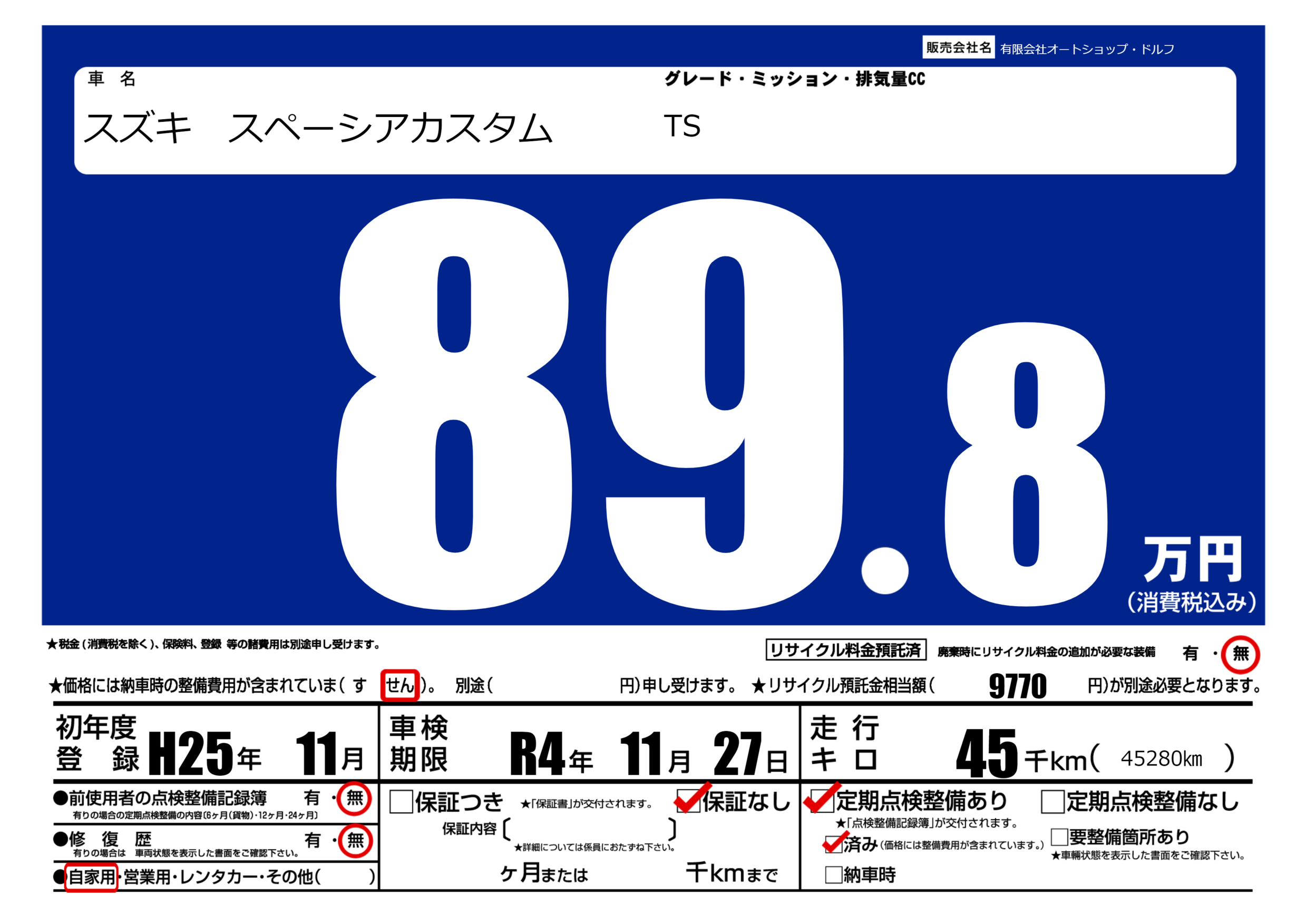 | 定期点検整備 | 定期点検整備あり 定期点検整備済み | ||