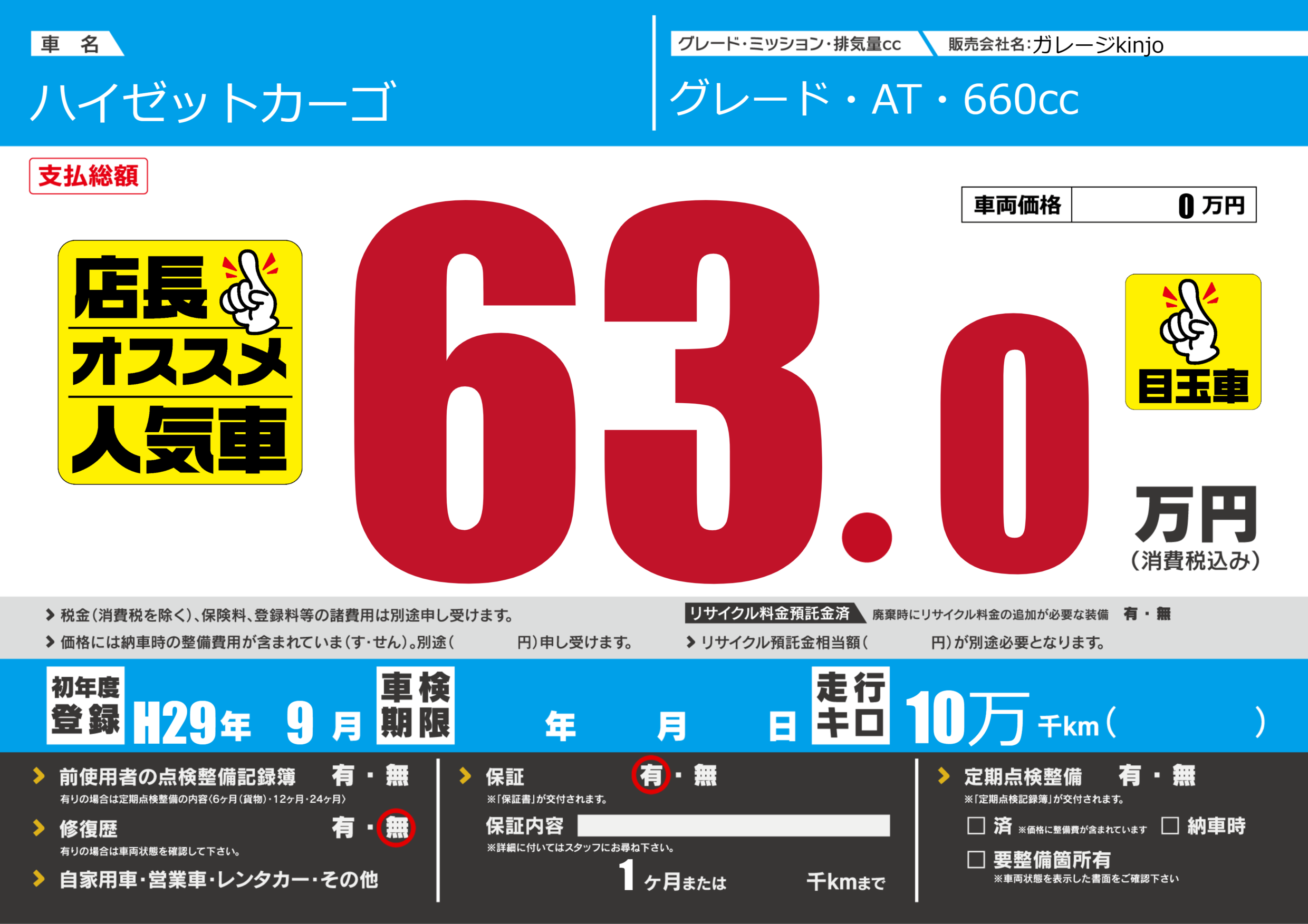 保証付き 保証内容(---) 1ヶ月または()千kmまで |