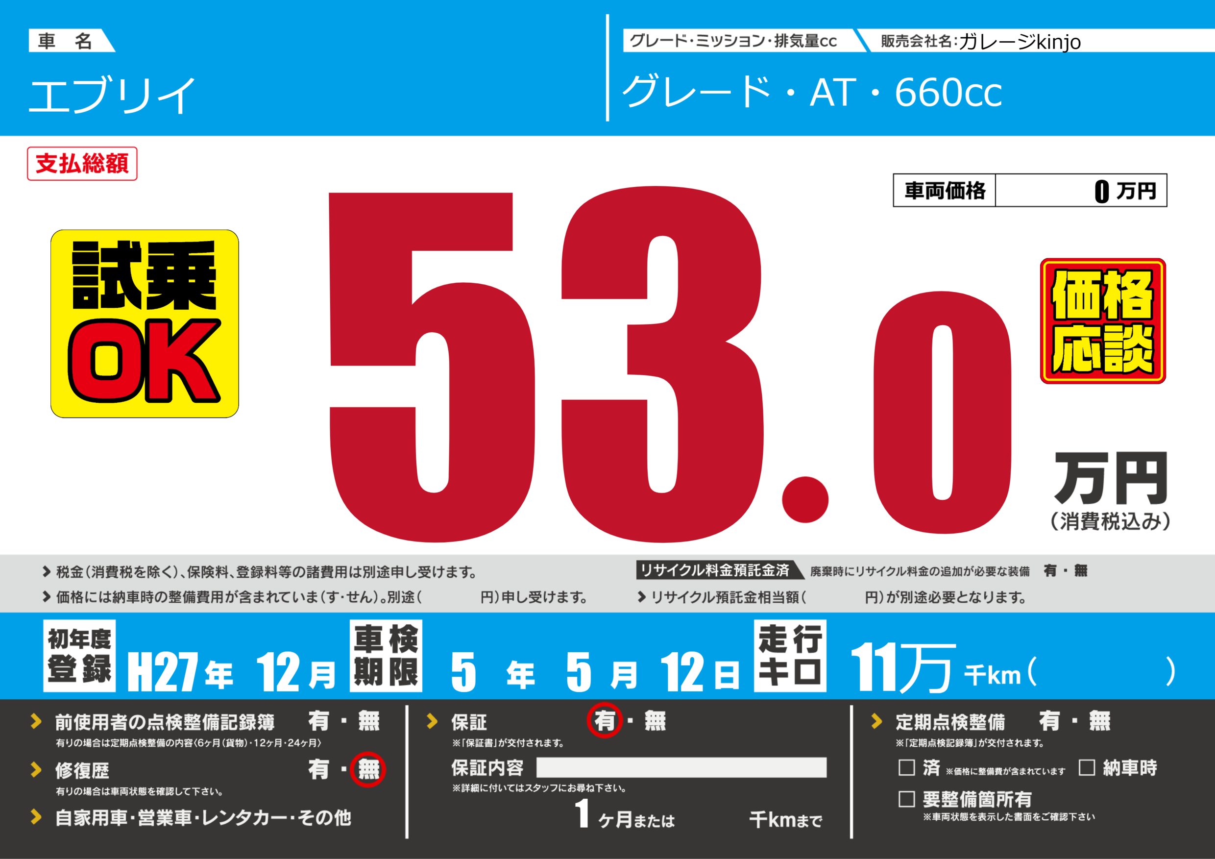保証付き 保証内容(---) 1ヶ月または()千kmまで |