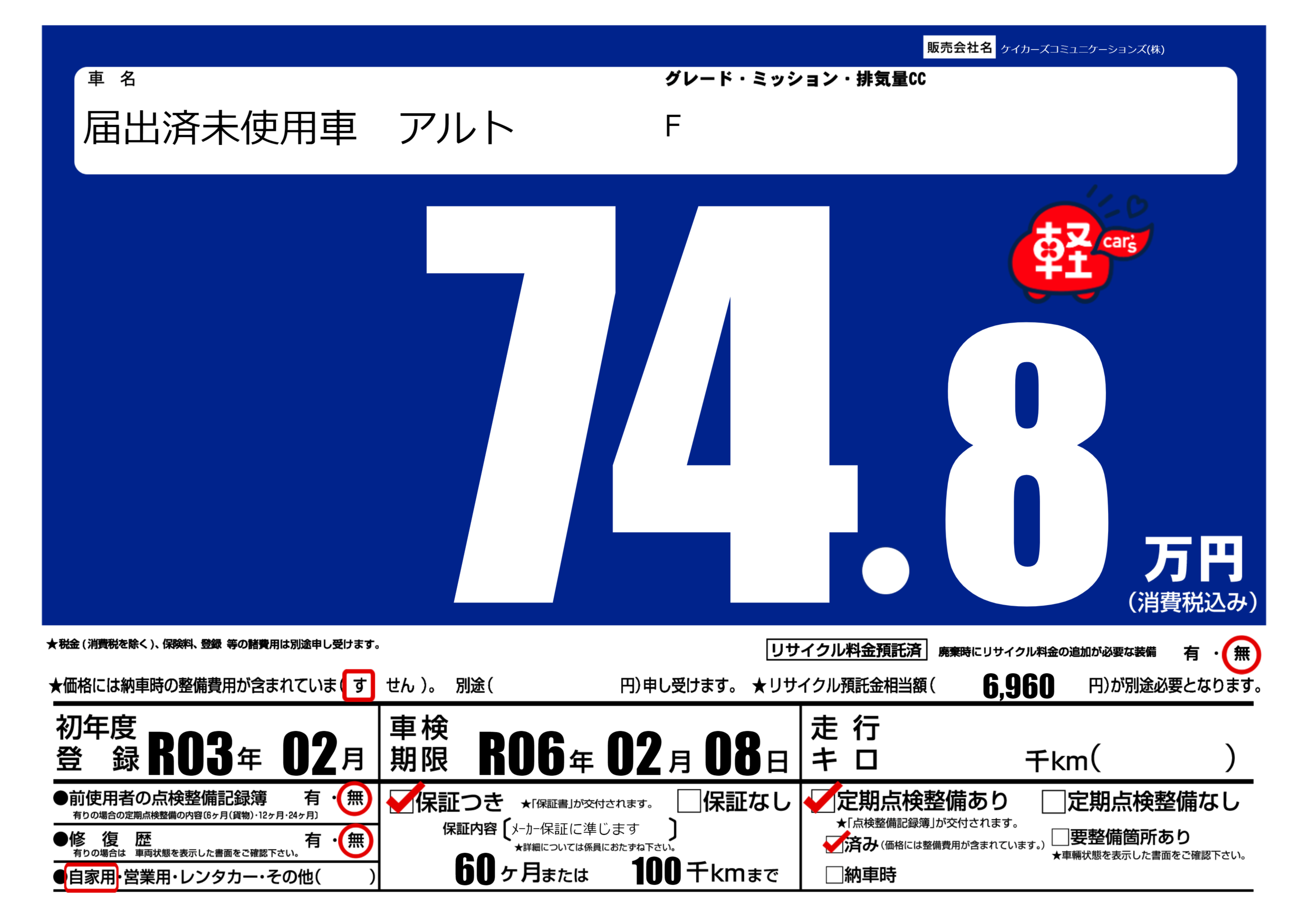 | 定期点検整備 | 定期点検整備あり 定期点検整備済み | ||
