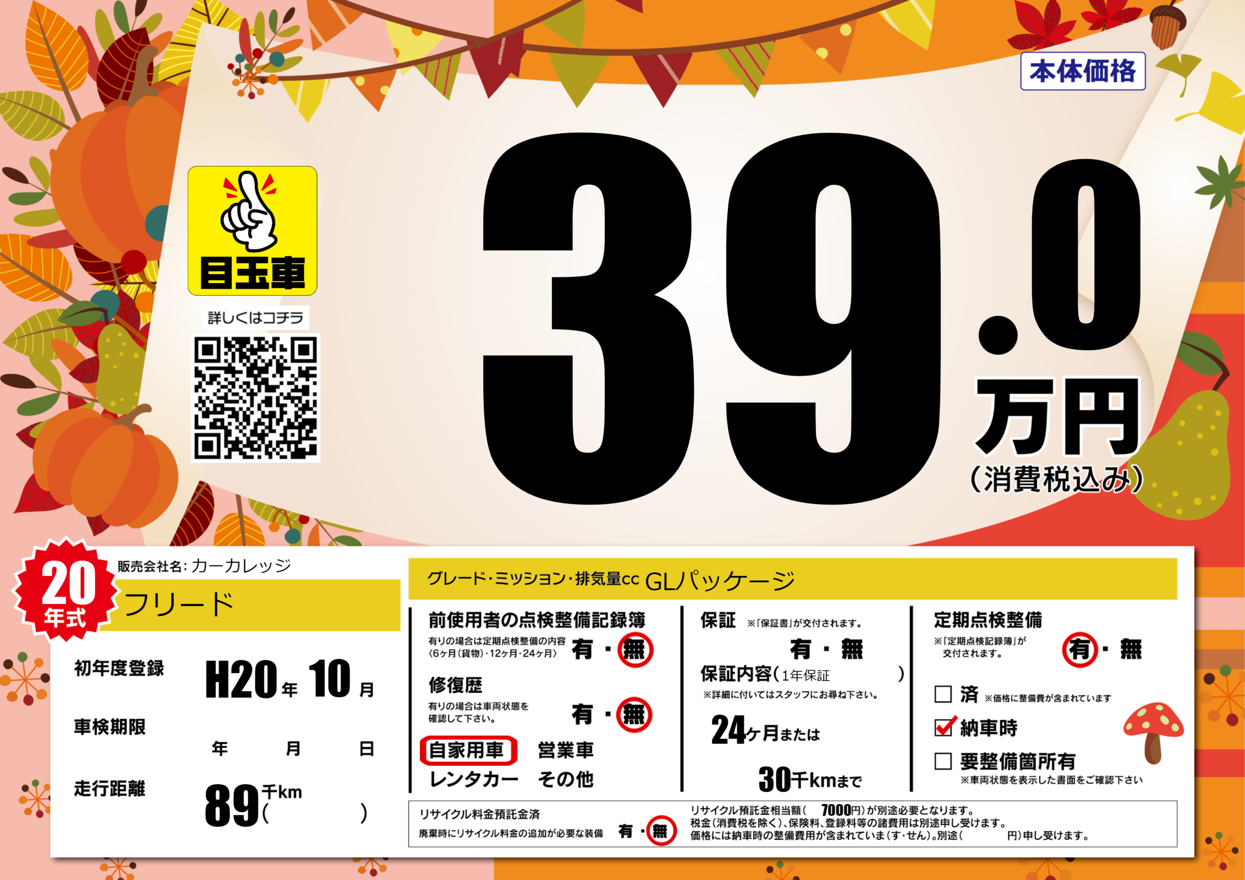 | 走行キロ | 8.9万km | 初年度登録 | H20年10月 |