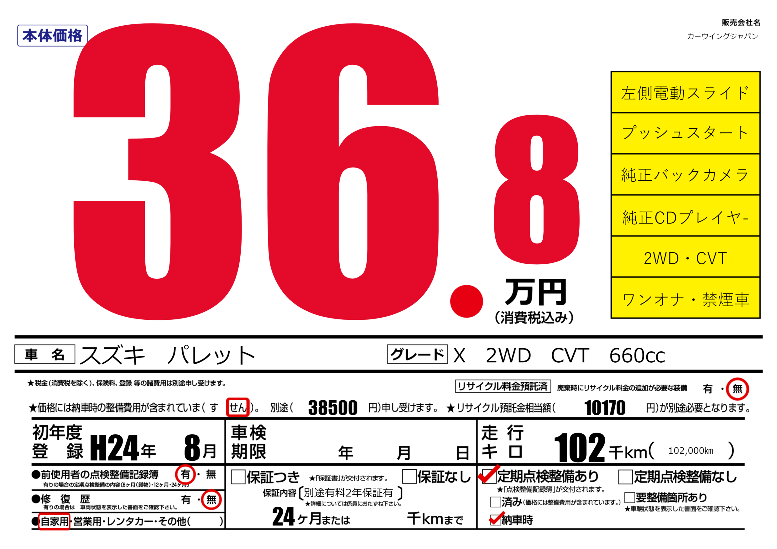 | 車名 | スズキ パレット | グレード ミッション 排気量 |