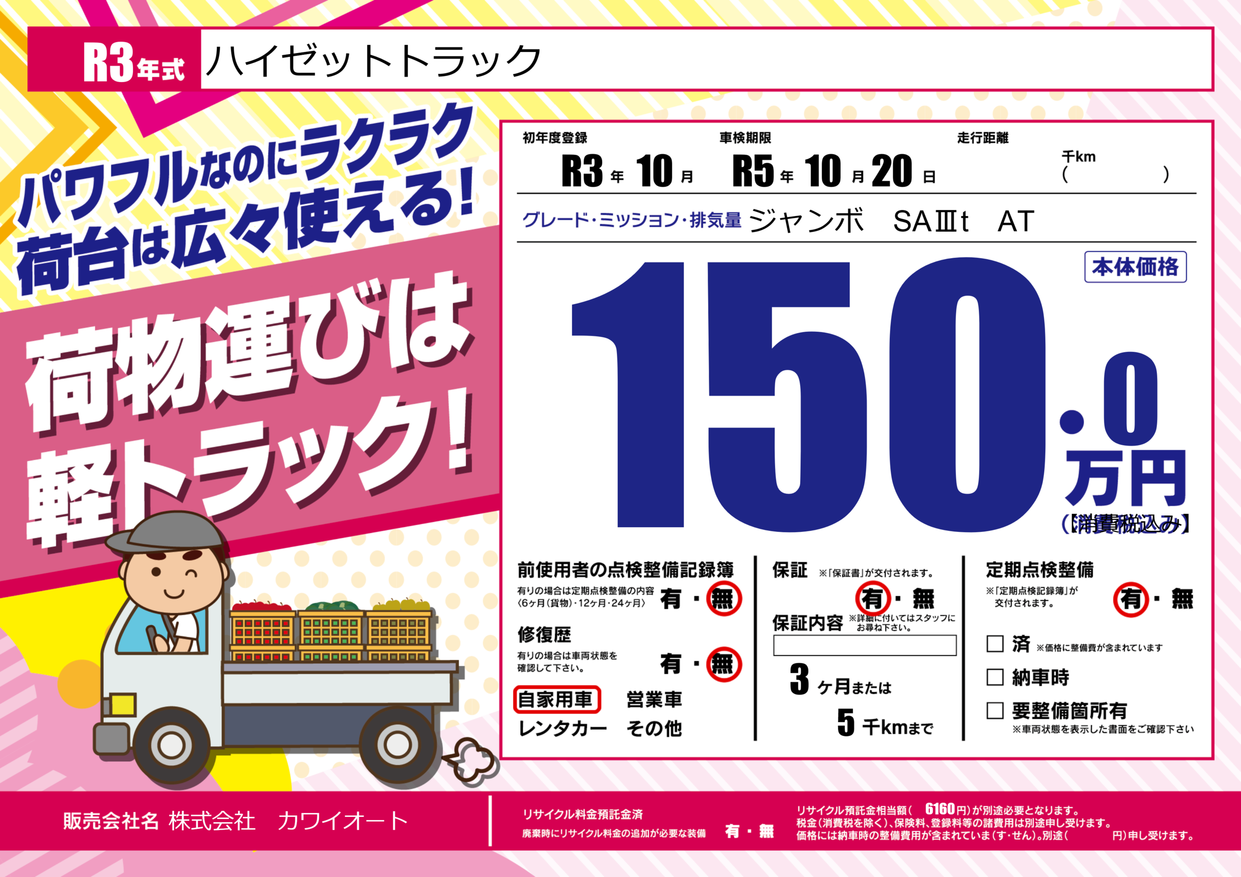 | 車名 | ハイゼットトラック | グレード ミッション 排気量 |