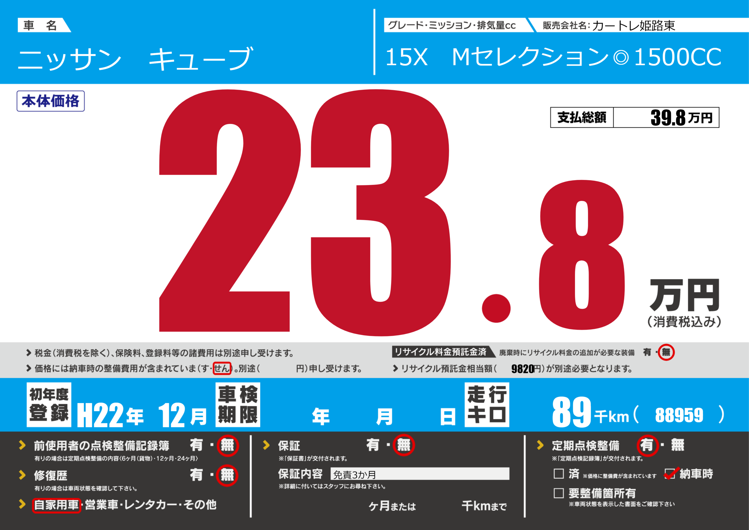 | 車名 | ニッサン キューブ | グレード ミッション 排気量 |