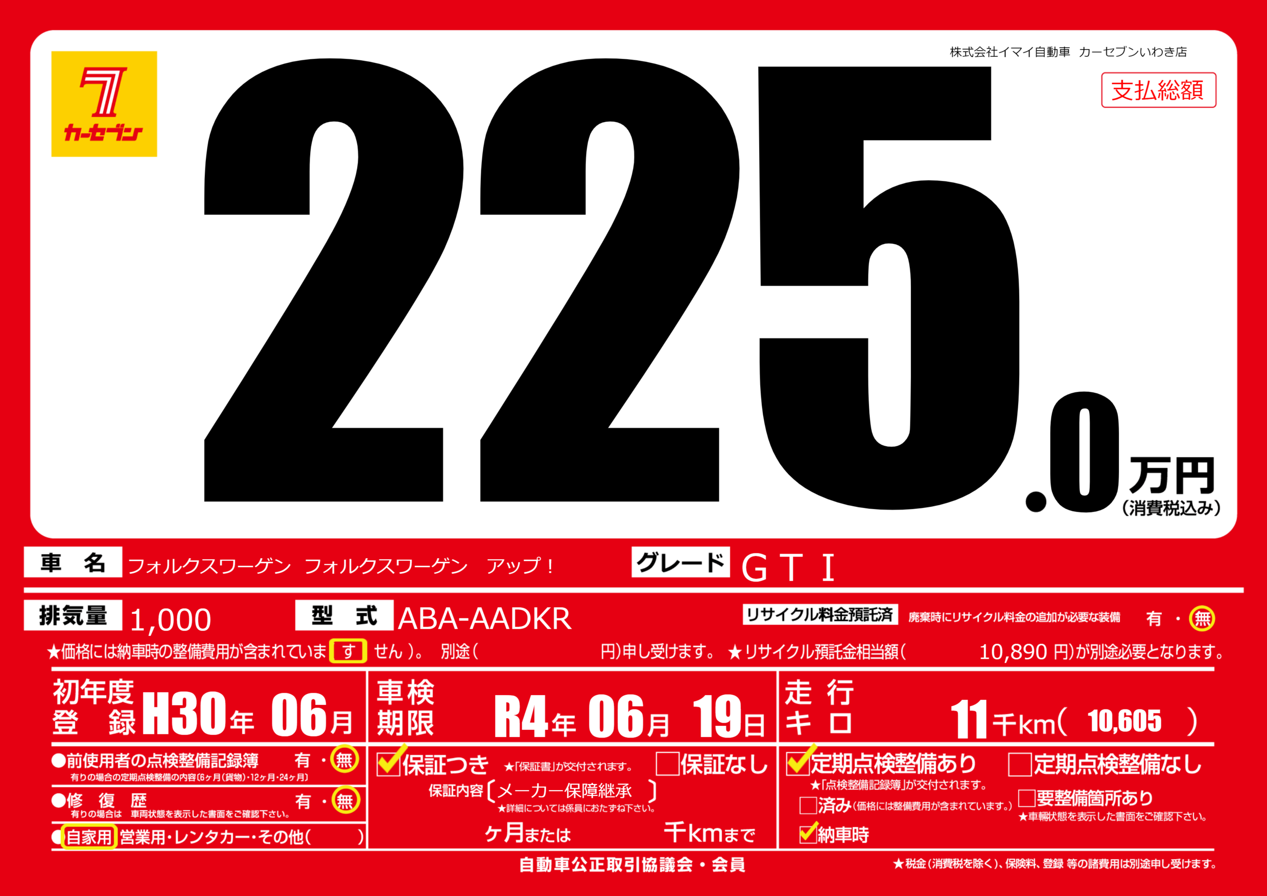 | 車名 | フォルクスワーゲン フォルクスワーゲン アップ! | グレード ミッション 排気量 |