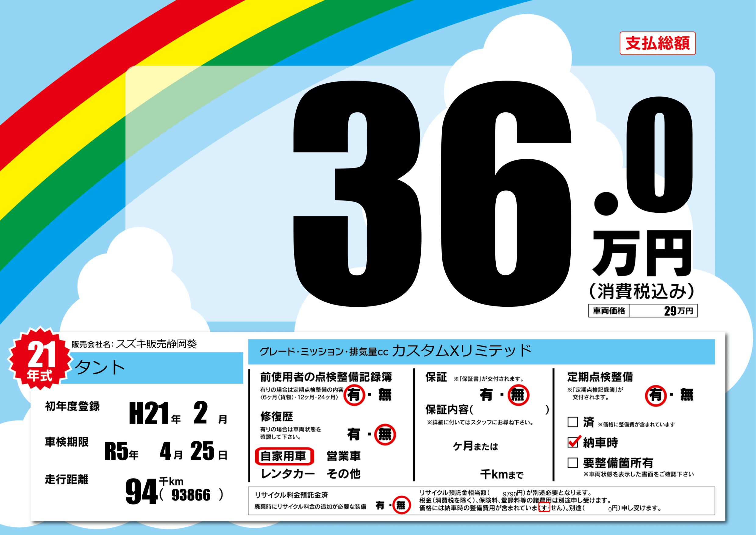 | 定期点検整備 | 定期点検整備あり 納車時あり | ||