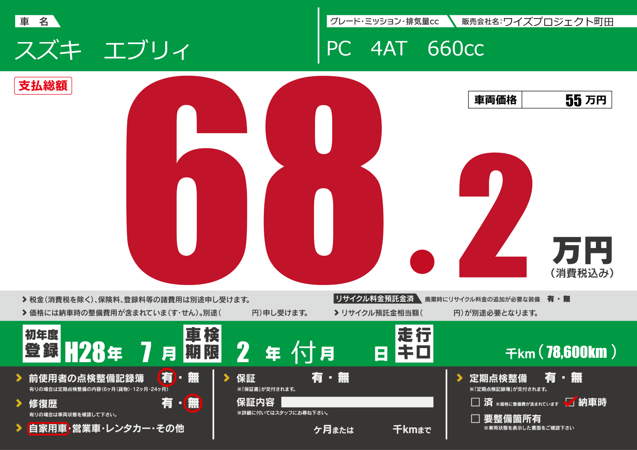 | 車名 | スズキ エブリィ | グレード ミッション 排気量 |